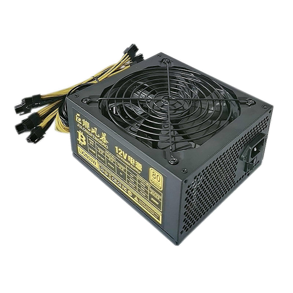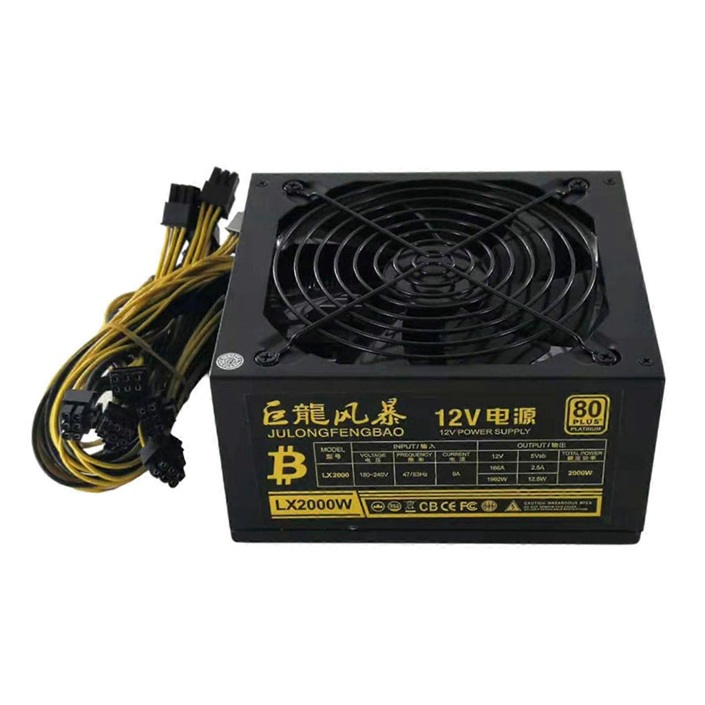 Features: and high quality The for shell is made of high-quality materials, which is not easy to be broken and very durable. Large fan design, better heat dissipation and longer service life. It needs a wide voltage of 100-240V to work! The efficiency is as high as 80 to reduce your electricity bill. Complies with ATX 12V V2.3. The fan speed is automatically controlled by the thermal sensor inside the power supply. The maximum power output is 2000W to ensure the stability of the power supply. 18 AWG copper output wire, rich output interface. Specifications: Colour: Black material: metal Maximum power output: 2000W Conversion efficiency: up to 80% Support GPU: 8 GPUs Compatibility: Suitable for Bitcoin/Litecoin miners. Note: If the voltage is not suitable, you need to provide your own power adapter Note: Light shooting and different displays may cause the color of the item in the picture a little different from the real thing. The measurement allowed error is +/- 1-3cm. Package includes: 1 x Power Supply for Bitcoin Mining