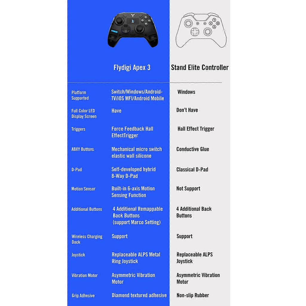 Features: Innovation force feedback trigger feels the real accelerators and gun-trigger by finger, its stroke, damping and shock will convey the physical characteristics of the game to the triggeer to make gaming experiences more immersive. Built-in 6-axis gyro motion sensor, provides a great motion-control, you can beat competitors in gaming by accurately controlling the moving speed, attack speed, and attack strength of the game characters. Asymmetric vibrating motor which can enhance immersions in games, alone with ALPS-rocker, bring you a more realistic real-time gaming experience. Full-color LED display screen, ABXY mechanical buttons can provide quick response and mechanical para-graph feel, flexiable wall silicone makes the for key feels more soft and comfortable. Multiple connections, bluetooth-compatible / wired, for Switch/for Windows/ Android-TV/iOS-MFI/Android cell phones. Specifications: Material: Plastic-material Size: Approx. 155x104x64mm/6.10x4.09x2.51 inch Name: Force Feedback Trigger Elite Gaming Controller Model: Flydigi Apex 3 Platform Supported: for Switch/for Windows/ Android-TV/iOS-MFI/Android Mobile Screen: Full-Color LED Display Screen Triggers: Force Feedback Hall Effect Trigger ABXY Buttons: Mechanical Micro Swicth Elastic Wall Silicone DPad: Self-developed Mixed 8-way Dpad Motion Sensor: Built-in 6-axis Motion-sensing Function Additional Buttons: 4 Additional Remappable Back Buttons(Support Macro-Setting) Wireless Charging Dock: Support Joystick: Repalceable Metal-ring ALPS-Joystick Vibration Motor: Asymmetric Vibration Motor Grip Adhesive: Diamond-textured Adhesive Note: Please allow 1-2cm errors due to manual measurement,pls make sure that you do not mind before you order. Due to the difference between different monitors, the picture may not reflect the actual color of the item. Package includes: 1 Piece Gaming Controller