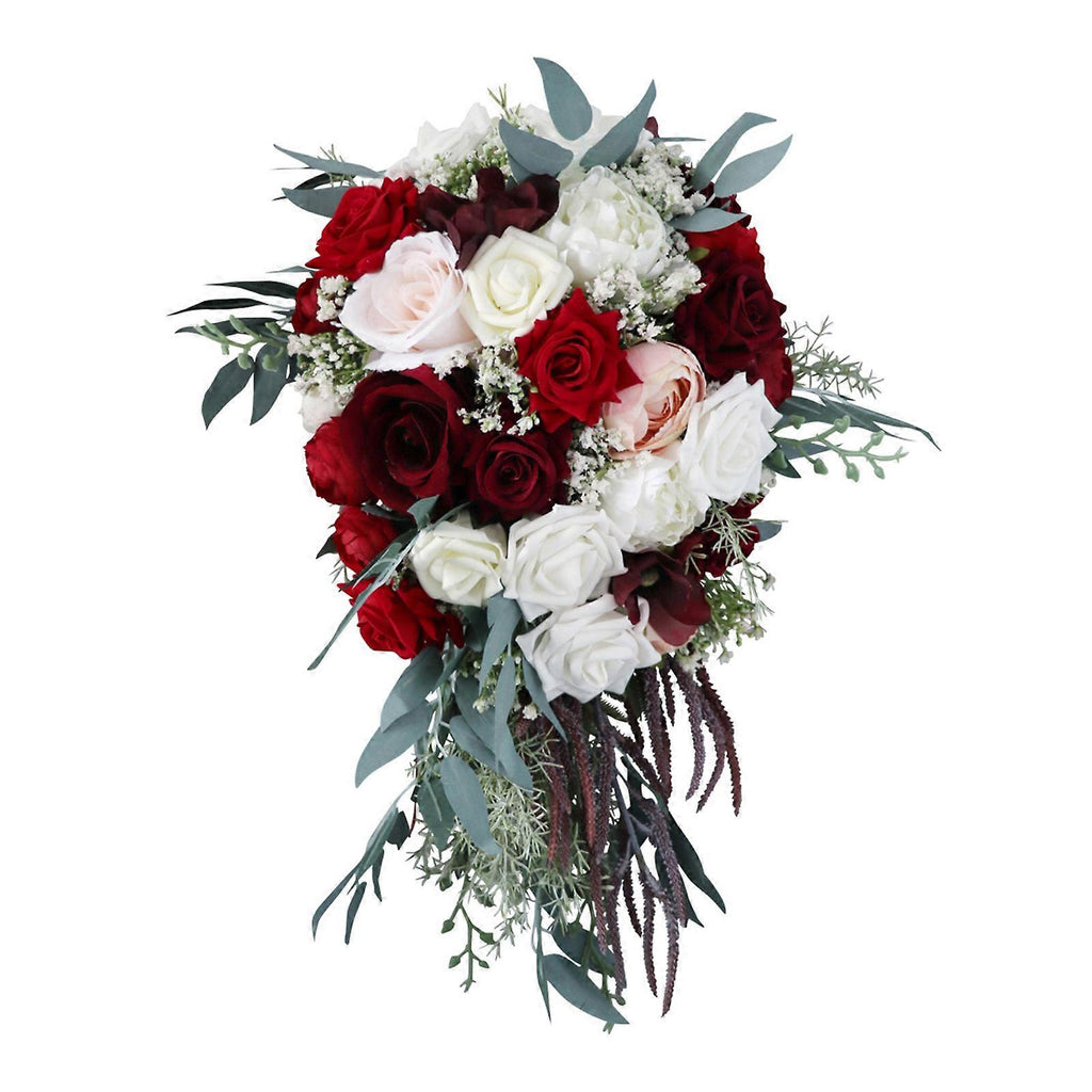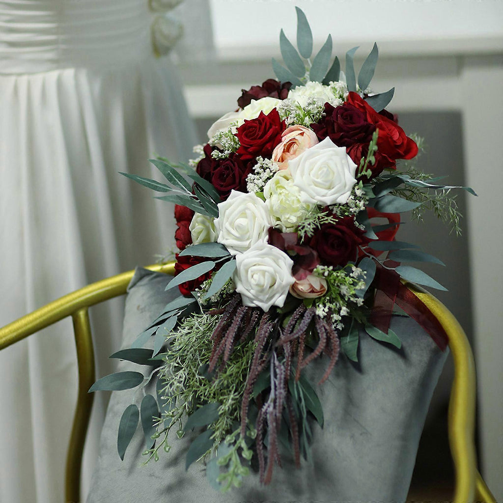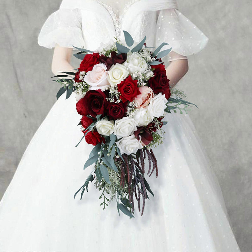 Wedding Bridal Bouquet Waterfall Shape Cascading Artificial White Wine Red Rose Rustic Vintage Bridesmaid Holding Flower