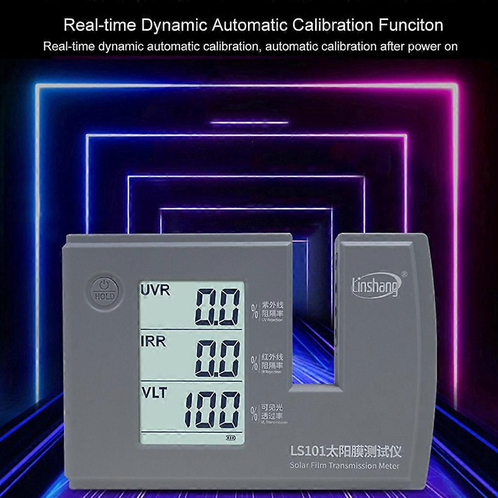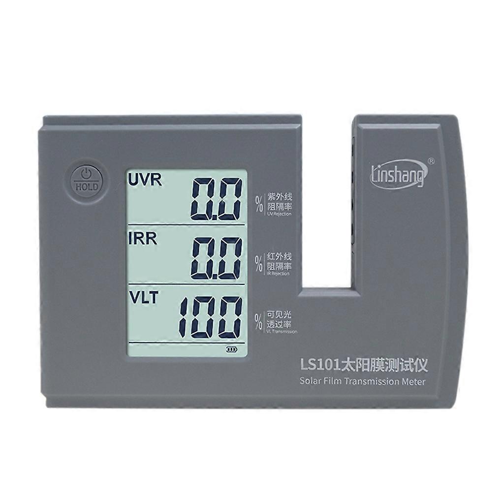 LS101 Window Tint Glass Solar Film Transmission Meter Ultraviolet Infrared Rejection Rate UVR IRR VLT Tester Overviews: LS101 is able to measure and display UV, IR rejection value and visible light transmission value simultaneously. This meter is self-contained light sources and self -calibration. No manual adjustment is needed. The users only need to plug the power supply, turn on the switch and put the solar film in the slot. The resulting performance data will appear on the display interface. Features 1.Adopt large-screen LCD with backlight, which can be used without light. 2.Adopt parallel light source design which is suitable for testing the thick materials. 3.UV rejection meter, IR rejection meter, light transmittance meter, three function in ONE device. 4.Equipped with real-time dynamic self-calibration function, which is automatically calibrated after powering on. 5.Powered by USB Type-C interface or the 5V power supply. 6.Ultra low power consumption, 4 AA alkaline batteries, lasting more than 180 hours. 7.Applicable to the transmittance (rejection rate) test of automotive film, explosion-proof film, architectural film, thermal film, film glass, etc. 8.Simple operation, putting the testing sample in the test slot, UV Rejection, IR Rejection, Visible light transmission value of the sample will be displayed simultaneously. 9.Applicable to solar film performance exhibition, production, quality inspection, inspection and other occasions. Parameter 1.Size: 175mm*120mm*30mm (L*for W*H) 2.Test slot: 23mm * 76 mm (for W*H) 3.Weigh: 360g 4.Resolution: 0.1% 5.Accuracy: 2% (Colorless and transparent material) 6.UV for Peak wavelength: 365nm 7.VL for Peak wavelength: 380-760nm, conforming to the CIE photopic for vision function standard 8.IR for Peak wavelength: 950nm 9.Power supply: 4*AA alkaline battery(Not included) or 5V AC/for DC power supply (USB Type-C interface) Package included:(with retail box) 1 * LS101 Solar Film Transmission Meter 1 * User Manual