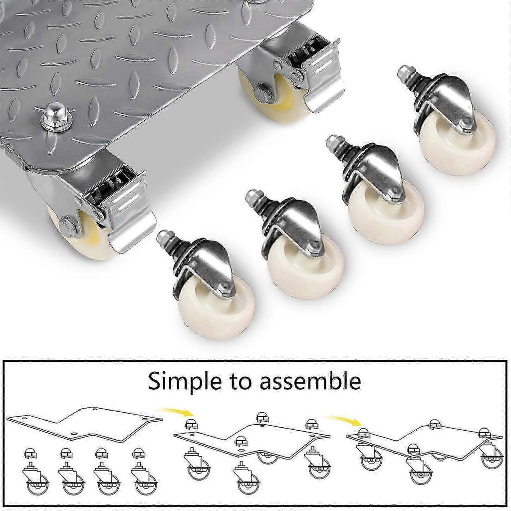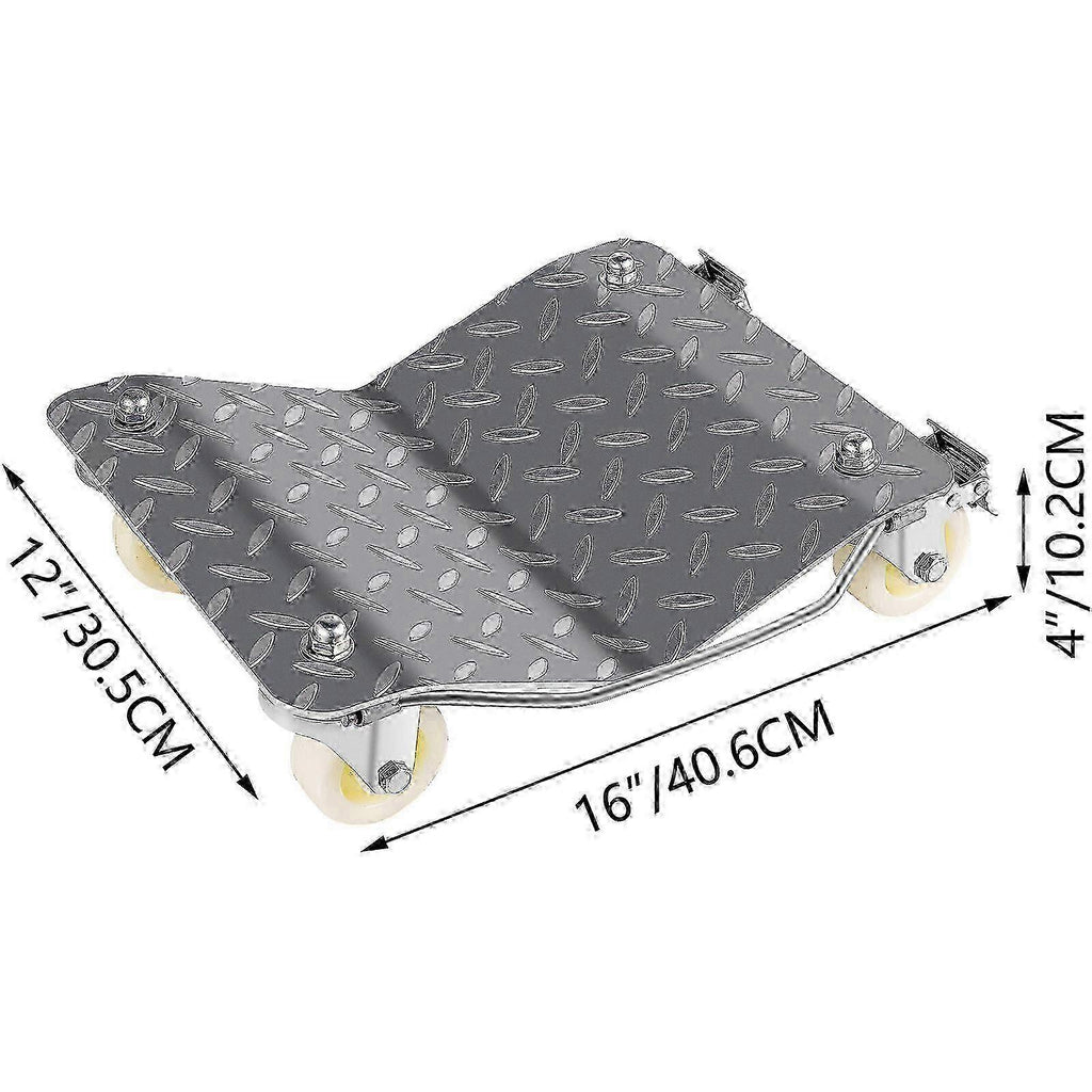 1.6000LBS WEIGHT CAPACITY - The large 16-inch long x 12-inch wide plated ball bearings are designed to support the weight of your vehicle. And each car dolly supports up to 1100 lbs, totaling 4400 lbs. This set makes restoration projects of medium and heavy wheels easy and simple. 2.SOLID CONSTRUCTION - The wheel dolly is made of thick diamond-plate steel that is durable and rust-resistant. It can support an impressive weight and will not bend out of shape while working, which ensures high work efficiency and safe operation. 3.CONVENIENT OPERATION - The tool is easy to install. You only need to install the included 3-inch (7.6 cm) ball-bearing wheels on the base, and then you are ready to get moving. And each wheel dolly is equipped with a convenient handle that makes you easy to carry the tool to your desired location. 4.UNIVERAL CASTERS - Four dual-bearing swivel casters allow mobility in all directions by providing 360rotation, making the dolly optimal for one-person work. Each dolly is equipped with locking mechanisms that keep them in place when you need them to stay still. 5.VARIOUS FUNCTIONS - The wheel dolly is an ideal option for garage, auto sales showrooms, workshops, etc. It is also applicable to the restoration of cars, trucks, trailers, tractors, motorcycles, lawnmowers, furniture, and other equipment. ******************************************************************************************************* *Specifications Color: Silver Material: Heavy Duty Powder Coated Steel Construction Caster Material: Plastic Finish: Powder Coat Platform Size: 12"(W) x 16"(L) / 30 x 40 cm Capacity: 1100 lbs Each Castor Diameter: 3' / 7.5 cm ******************************************************************************************************* *Pakcage Content 4 x 4 Wheels Vehicle Dollies