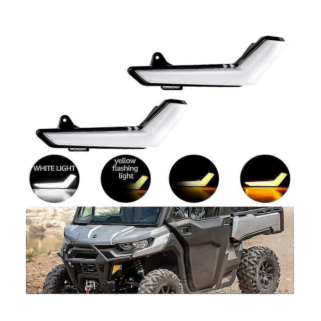 Condition: Power:2.36W White Light / 2.2W Yellow Light Operating Voltage: 12V DC Waterproof rate: IP 67 Lumen Value: 200LM Life Time: 50000 hours LED Color Temperature: white light+yellow light Modes: White light w/ yellow flashing light Placement on Vehicle:Front Item Fitment: Replace Part Number: 715006896 Compatible with Can Am 2020+ Compatible with Can Am Defedner Max 2020+ Installation: 1. High Waterproof Level:12V voltage and IP67 waterproof grade, so that the rear light can be unaffected in the wind and rain. 2. High Quality Material: Made of high quality PC and ABS, not easy to crack and good light transmittance. 3. Long Service Life: 50000 hours long service life,this light operates efficiently, requiring no greater amperage draw than a headlight. 4. Easy Installation:plug and play,projects a brighter, more powerful light beam. Colour:transparent Material:ABS Package Contents: 2 x Front LED Signature Light Only the above package content, other are not included. Note: Light reflection and different displays may cause the color of the item in the a little different from the real . The measurement allowed is +/- 1-3cm.