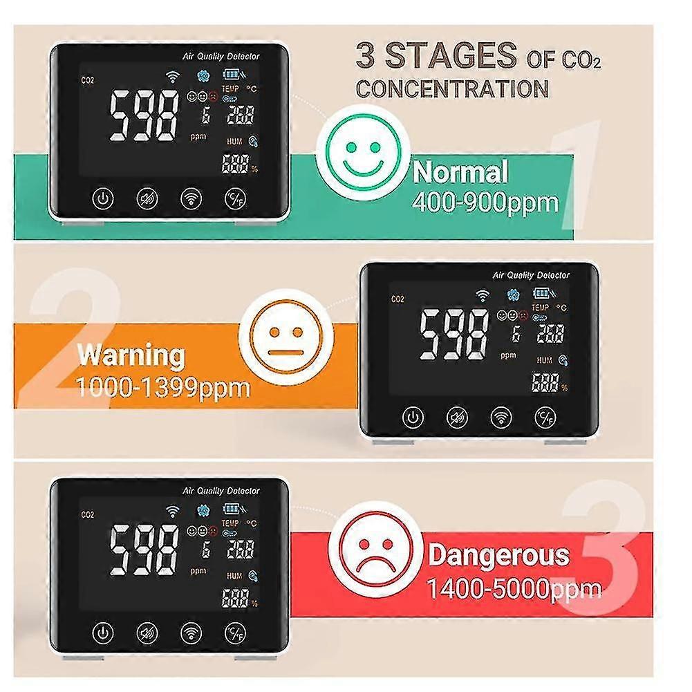Intelligent carbon dioxide value tester uses air semiconductor-sensor to monitor temperature and humidity of air quality. A 1000mAh lithium battery is embedded inside the indoorCO2 monitor, supporting a long time of continuous use, it adopts a and distinct LCD screen for ease for temperature or data viewing. display based on your need. This multifunctional air quality monitor can accurately detect the current CO2 concentration, temperature, and humidity in the air. It can help you understand indoor air quality at a . It can be placed on the desktop, and the back bracket can be adjusted in four gears according to the 's viewing angle requirements to the best viewing angle; it can be hung , and the screen can be clearly displayed and visible from a long distance. Wide Range of Application Scenarios: It can be applied to air quality detection in , and can also be used in greenhouse air quality detection and adjustment of plant growing greenhouses, or industrial application scenarios that require a environment 1. Product Name: Air Quality Detector 2. Model Name: -038 (WIFI Version) 3. Detecting Item: CO2 / Temperature / Humidity/ 4. CO2 : 400-5000ppm (50ppm + 6%) 5. : 0-99 6. Temperature : 0-55 (C/F switchable) 7. Humidity : 0-99% 8. WIFI : WIFI function active, display WIFI 9. Battery : Show battery usage and charging status 10. : value based on CO2 value, displaying value will be from 0-99 11. -Battery: 1000mAh ( Working time: 3-5 Hours ) 12. Type-C Power Supply: 5V/1A 13. WIFI supporting: Tuya WIFI+BT CB3S 14. Working current: 5V/500mA 15. Rated Power:5W 16. Standby Current:Less than 3mA Name: Air Quality Detector Type: CO2 Measurement : Temperature and Humidity Meter air quality monitor: co2 detector Applications: Home, Office, Grow Tent, Wine Cellar, Garage color:White + black :ABS size:123 x 86 x 32mm Package Contents: 1 x Air Quality Detector 1 x Type-c charging wire 1 x Wall-mounted screw/Sticker 1 x English manual Only the above package content, other products are not included. Note: Light reflection and different displays may cause the color of the item in the a little different from the real thing. The measurement allowed error is +/- 1-3cm.