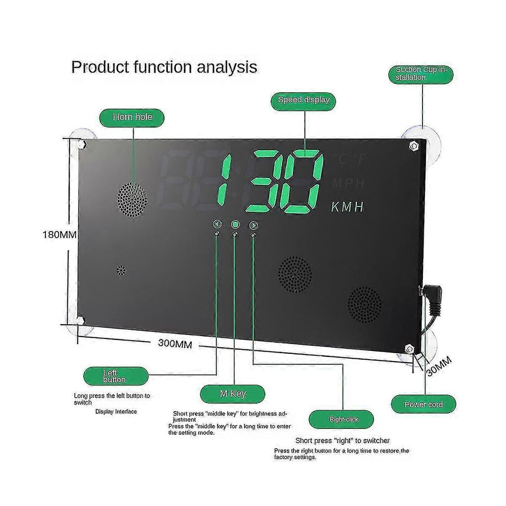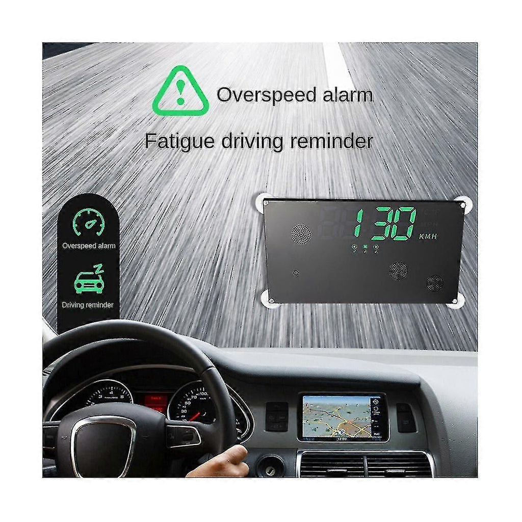 Applicable to domestic car series, Asian car series, American car series and European car seriesEquipped with high-precision GPS + Beidou dual-channel moduleFully automatic monitoring of vehicle driving conditionsSuper font HD displayLED light displayDesigned with PC high temperature resistant material with the car, automatic sleep function when parkingDouble display on front and backSpeed, time, temperature displayOverspeed alarmThis product is a car HUD rear window display instrument, through GPS/NorthThe dual-channel module obtains data from satellites, and has the advantages of dual-signal stability.Universal for all models on the market.Product parametersGPS car Power supply: 11.5V~30V;Working environment: -40~+80;Speed range: 0~199;Clock error: Less than 1minute;Colour:blackMaterial:PCPackage Contents:1 x heads up displayOnly the above package content, other products are not included.Note: Light reflection and different displays may cause the color of the item in the picture a little different from the real thing. The measurement allowed error is +/- 1-3cm.