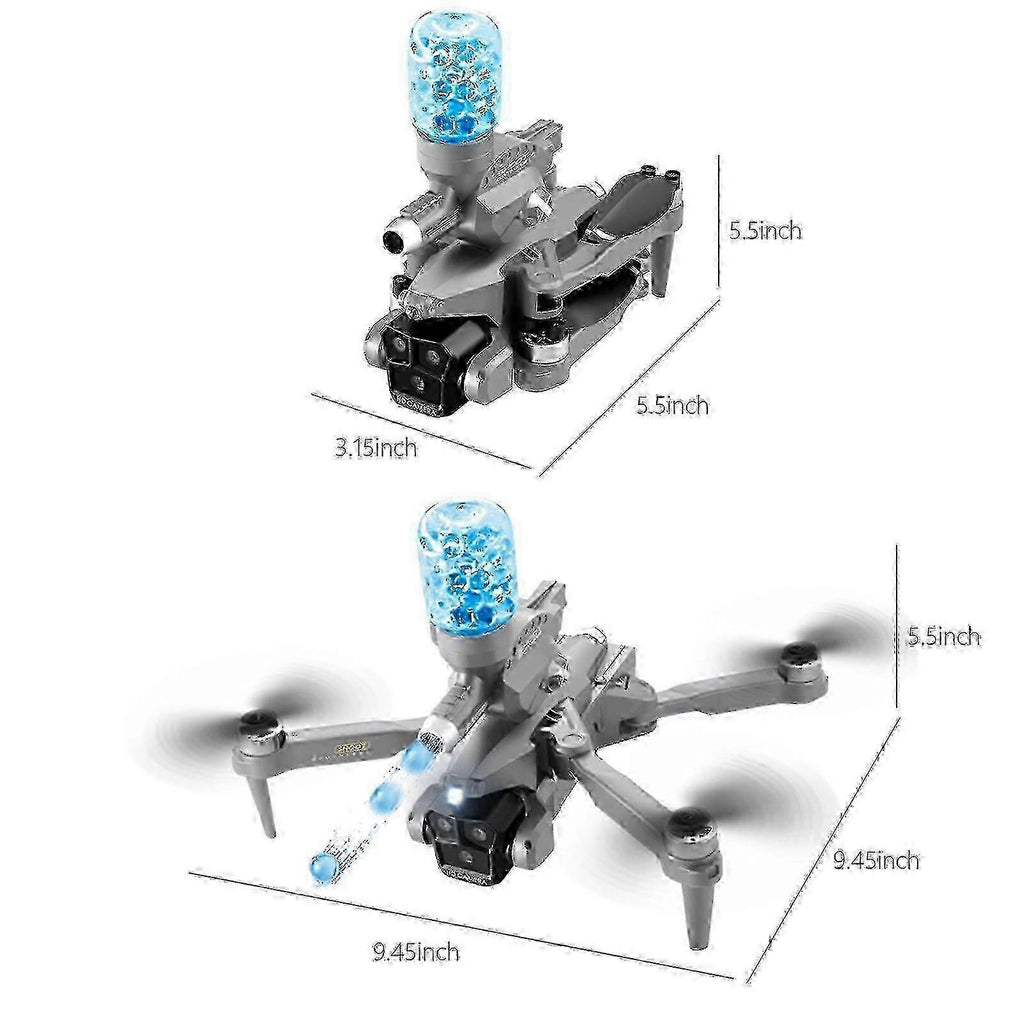 Water Bomb Drone New design, our drone can inject water bombs with a range of up to 20 feet, paired with packs of water bombs (about 3000 rounds ). Install ammunition on the drone to experience real combat scenes. What are the benefits of brushless motors?The brushless motor arms provide strong power to achieve stable and fast flight of the drone. It holds a position quite stable even in wind with the powerful brushless motors better than other competitor drones. This brushless motors are less noisy, easier to control , more energy-efficient and last longer compared to brushed motors. A perfect flying experience for you. Better Flight Experience With WiFi function, it can be connected to applications, APK system, and take photos, videos, and real-time transmission through mobile phone camera images. And functions like Altitude Hold, Headless Mode, Take Off/Landing and Speed Adjust is so easy to beginners or newbies. Immersive ExperienceIntelligent 360 obstacle avoidance. When the obstacle avoidance function is automatically avoiding obstacles.VR experience. Through mobile app with VR glasses, you can feel the emptiness from the perspective. FunctionOne button take-off/ landingrising and fallleft/right steeringforward and backwardleft /right flysmart obstacle avoidancesmart follow360 rollheadless modeFast/Medium/Slow speedphotovideo choose dual camerasface/gesture recog-nition to take pictures automaticallygravity sensingtrack flightfixed heightfine-tuning left and right.
