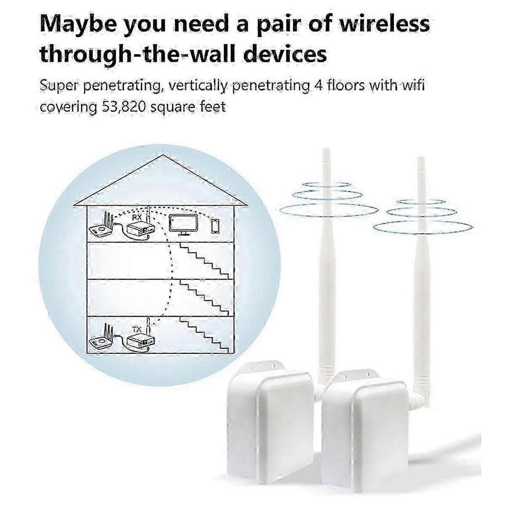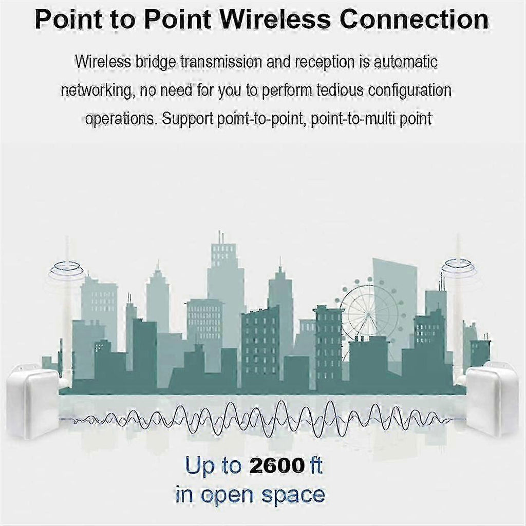 Point to Point Wireless Bridge:Wireless Bridge Point-to-Point uses wireless communication technology to transmit network data using air as a medium to carry out long-distance point-to-point or point-to-multi point interconnection. It can extend to another building, and it can also extend your monitoring range. Easy to Install:Just connect the transmitter to the computer and the receiver to the IP camera to achieve video surveillance. Wireless bridge transmission and reception is automatic networking, no need to perform tedious configuration operations. Support point-to-point, point-to-multi point, transmission/receiver flexible switching. Operating in the 902MHz-928MHz frequency band, with strong penetration and diffraction capabilities. Long Range Transmission:Wireless Ethernet bridge is transmitted by infrared has excellent performance. Indoor use can achieve signal transmission through 4 walls, with a transmission distance of 492 feet. Outdoor use can achieve long-distance transmission up to 2600 feet(Light of Sight). Suitable for inconvenient long-distance layout of network cables, ideal for farms, wharf, garden, car park, etc. Strong Signal Transmission:Connect one of the wireless bridges to the IP camera and the other to your computer for long distance monitoring without the need for long distance wiring or additional routers. Make long-distance wireless coverage, data transmission and wireless monitoring easy and professional. It meets many scenarios that require long-distance wireless transmission needs such as buildings, factories, farms, construction sites, warehouses, elevators, etc. Plug Type:US Plug,it applies to Canada, India,Mexico, Thailand, the , the Philippines,Taiwan and so on. voltage:AC100-240V Colour:White Material:ABS The actual product may have slight color difference or difference, which not affect the use Package Contents: 2 x Wireless bridge with Antenna 2 adapter 2 x Ethernet cable Only the above package content, other products are not included. Note: Light reflection and different displays may cause the color of the item in the picture a little different from the real thing. The measurement allowed error is +/- 1-3cm.