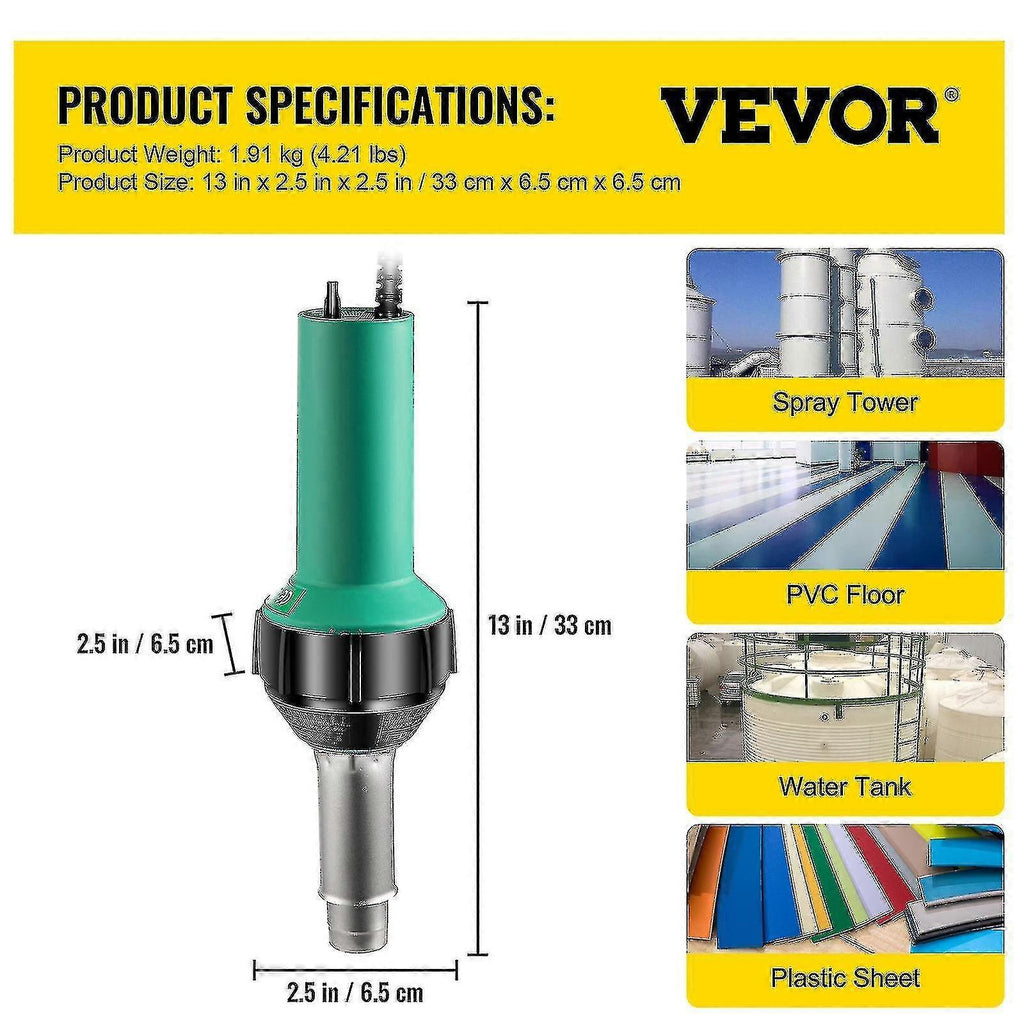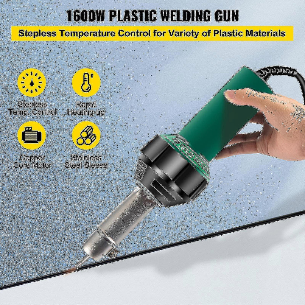 *KeyFeatures*PROMINENT PERFORMANCE- Our plastic welding gun kit has a pure copper motor that features the following traits: 1600W, 220V, 50HZ, 7A. The hot air equipment is suitable for welding PE, PP, and PVC plastic sheets.*REPLACEMENT NOZZLE- There are four welding nozzles included in the package: round fast welding nozzle, triangle quick welding nozzles, flat welding nozzle, and meeting various demands for construction purposes.*9.8FT CABLE LENGTH- Its cable length is 9.8 FT/3M, which is longer than many other cables. Stepless temperature regulation with a range of 104-1112 F/40-600 for different melting points.*NECESSARY KIT- We use a high-quality heating core to achieve the effect of stable heating, which can better achieve the repair object. There are many valuable tools and parts that are easy to operate.*WIDE APPLICATION- The machine can be collocated with a round nozzle, flat nozzle, and fast welding nozzle to weld PVC plastic floor, PP plate water tank, pipe, electroplating bath, etc.********************************************************************************************************SpecificationsModel: VV-PWG-A08-02Voltage: 220V, 50HZCurrent: 7APower: 1600WCable Length: 9.8ft/3mNoise: 67 DB(A)Air Volume: 240L/minAir Pressure: 8.48cfmInsulating Intensity: Double InsulationTemperature Scope: 104F - 1112F/40C - 600CColor: GreenItem Weight: 4.2LBS/1.74kgPlastic Welding Gun Size: 13" x 2.5"/33 x 6.5 cm********************************************************************************************************Pakcage Content1 x PVC Welding Gun1 x Round Quick Welding Nozzle2 x Triangle Rapid Welding Nozzles1 x Flat Nozzle1 x Roller1 x 110V/230V Mica Pipe Heating Core1 x Toothbrush1 x Slotting Knife1 x Manual