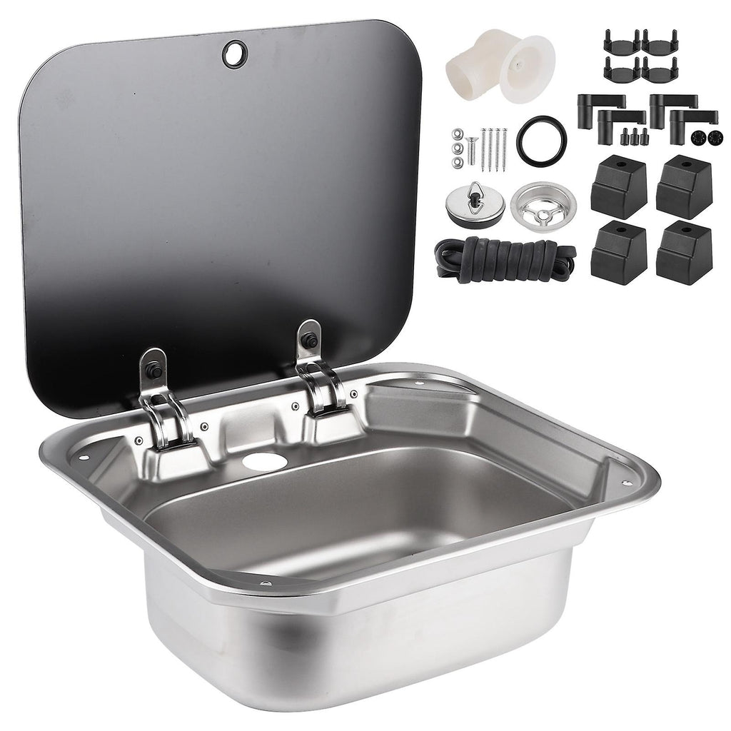 Features 1??Made of low?carbon 304 stainless steel, which is anti?radiation and oxidation resistance and has a long service life. 2??Humanized design and installation hardware can help you complete cleaning or cleaning work, even if you travel in the wild, you can easily enjoy clean and clean fruits and vegetables. 3??Each sink is equipped with anti?clogging and sealing plugs to control the water volume of the sink as you like. 4??Adding a thick rubber muffler pad to the bottom of the sink, effectively reduces the noise of water falling and also reduces the decibel of water sound, and bid farewell to the ding?dong sound of water droplets. 5??Toughened glass lid with openings on it, it is easy to turn over and close, durable and easy to clean. 6??Great kitchen sink, very suitable for yachts, motorhomes, caravans, RVs and so on. 7??This stainless steel sink has a large water outlet, with fast water outlet, for anti?clogging. Specification Condition: Item Type: RV Stainless Steel Sink with Lid Color: Stainless Steel Color Material: Stainless Steel(Sink), Tempered Glass(Lid) Opening Size: Approx. 395x350mm/15.6x13.8in Size: Approx. 420x370x160mm/16.5x14.6x6.3in Package List 1 x RV Stainless Steel Sink 1 x Adapter 1 x Rubber Strip 1 x Leak-Proof Base 1 x Seal Cover 1 x Rubber Ring 20 x Installation Accessory 5 x Fixed Screw 4 x Screw Cap