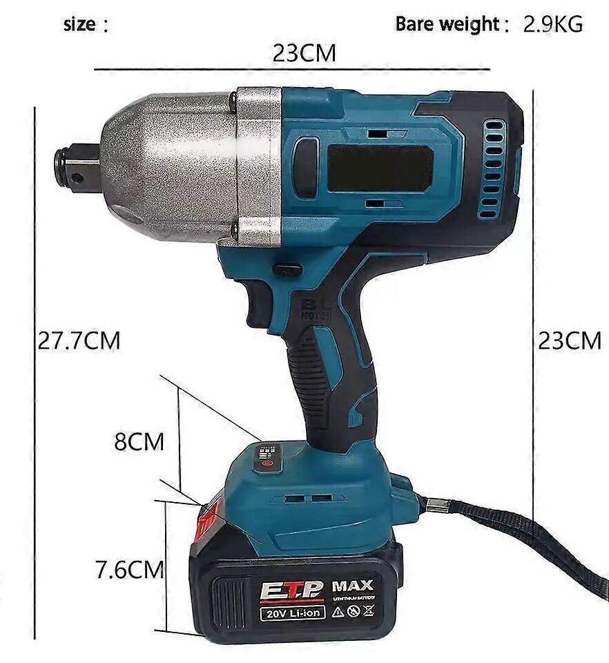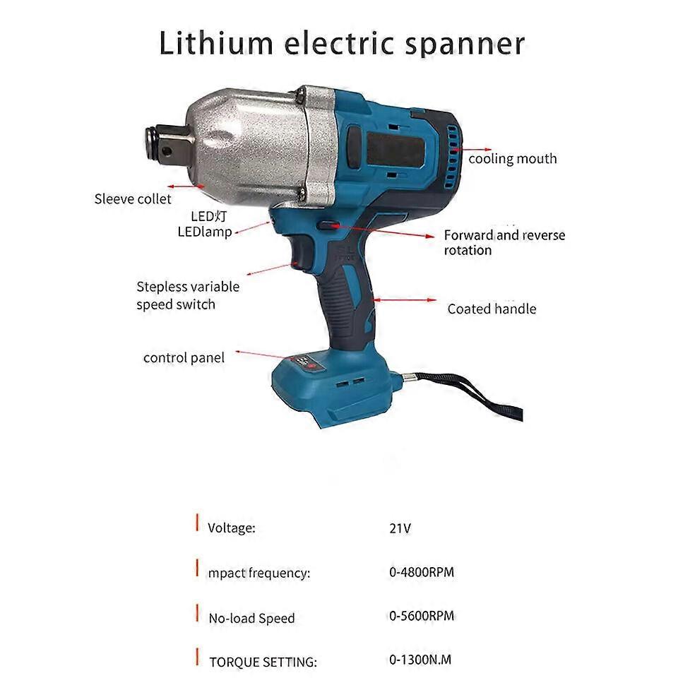 Specifications: Note: Does not includee Battery True 1300N.m 18V 3/4 Inch Brushless Cordless Impact Wrench Rated voltage: 21V Maximum torque: 1300N - m Square head size: 3/4 inch Speed: 0-5600 Impact frequency: 0-4800 Square drive: 3/4 Inch Bolt Diameter:34mm No load speed:0-2300r/min Rated impact rate:0-1800rpm Maximum torque:1300N.m 700N.m/900N.m/1300N.m three gears can be switched for Makita 21V Battery can be used on this tool. Package included: 1 x Cordless brushless impact wrench 1 x English manual 1 x Box