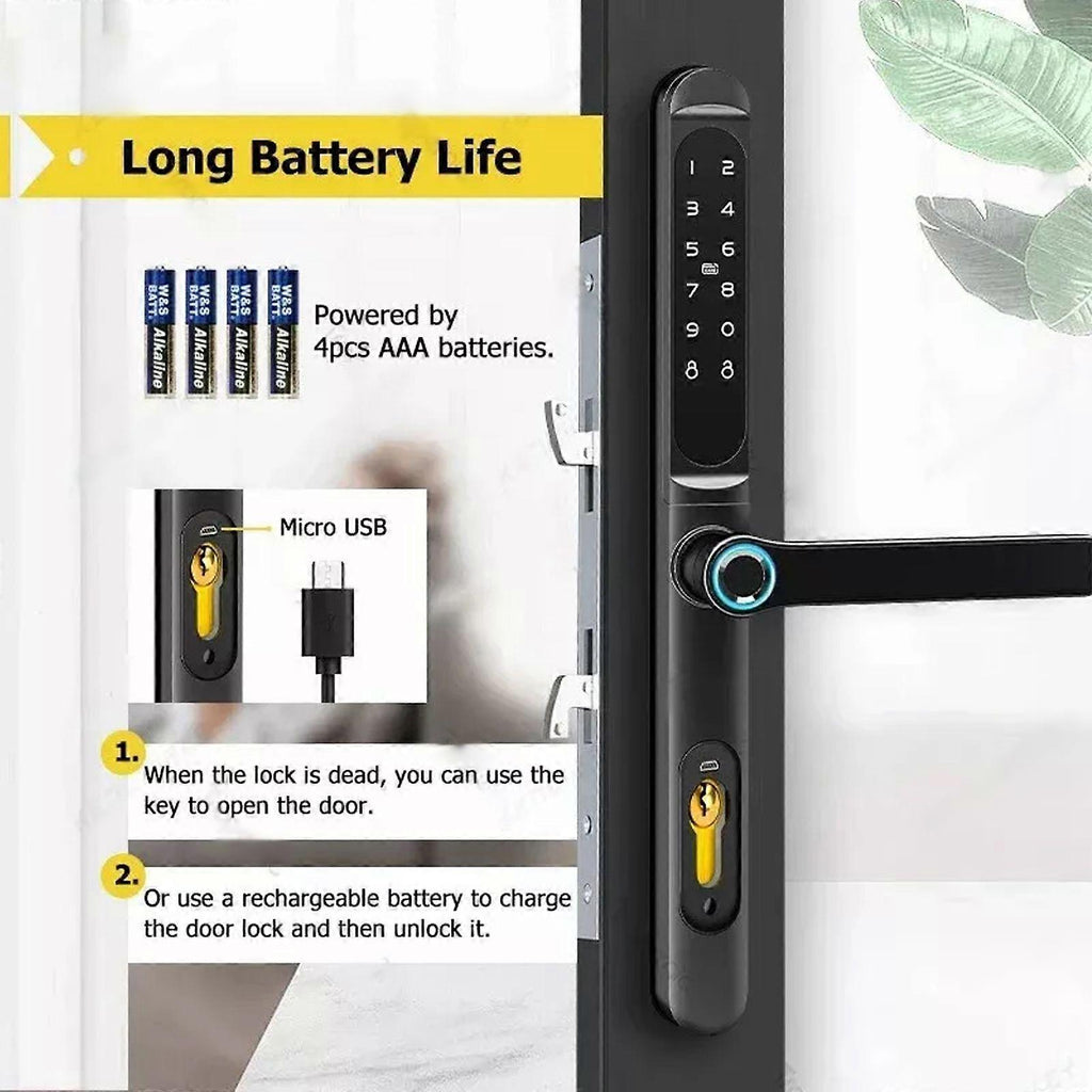 Specifications: Support App: TTlock app Material: aluminum alloy Unlock mode: APP / Fingerprint / Password / Smart card / Key Fingerprint read: FPC Sensor (Semiconductor Sensor) Color: Black / Silver Card User: 100 Fingerprint User: 100 Password User: 100 Chip Type: Dual Core Driver Read time: 0.3seconds Touch screen: IML Material Working power: 4 x AAA 1.5V batteries (not include) Operating temperature: -50 to 55 Centigrade Password function: support virtual password TT lock APP Functions: Tt lock app is a smart lock app, its multiple functions always satisfy your needs 1.The lock connect with the phone by Bluetooth. 2.Send temporary/ekey password remotely 3.You can open the lock / manage the lock (add user / delete user / set password and so on) 4.Add a G2 gateway if WiFi connection is required (Gateway buy extra)"Connect Alexa through G2 gateway Package Includes: 1x front lock panel 1x rear lock panel 2x waterproof rubber 1 x lock mortise 2 x RFID cards 2 x mechanical keys 1 x user manual 1 x screws kit