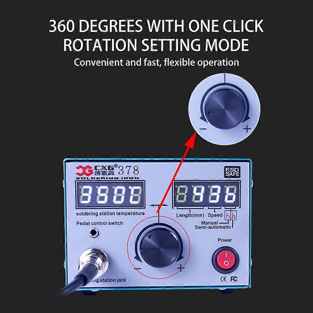 Specification Single tin output1~99(mm) Tin output speed: 1~32mm/sec adjustable Soldering station display: 4-digit LED digital Tin out display: 4 LED digital Tin out mode: manual (h), semi-automatic (b) Transmission motor: stepping motor Return tin adjustable: 1~50(mm) Compensation value function: +50 Tube length: 95mm Soldering station Model: CXG 378 Power consumption: 80W Temperature mode: /F Temperature range: 80~500C/176~932F Input Voltage: AC100/60Hz 220V/50Hz Applicable tin wire wire diameter: 0.8, 1.0, 1.2, 1.4 (mm) Product size: 128*116*80mm Weight: 1.65kg Power cord length: 1.2m Handle Model: CXG 901 Soldering iron head: 900M series Ceramic heating core: A1321B Resistance of the iron head to ground: 2 Soldering iron head to ground voltage2mv Handle wire length: 1.2M Handle length (without wire): 220mm Handle weight: 44g Product use range. Rich combination of model accessories to meet your multiple needs LED light strings, video and audio cable plugs, computer data cables, headphone cables, small electronic components, small circuit boards Product list: 1*378 main unit (including soldering iron) 1*Foot switch 1*Tin feeding tube 1*Universal bracket 1*Smoke feed spindle 1*Instruction manual 1*Certificate of Conformity/Warranty Card