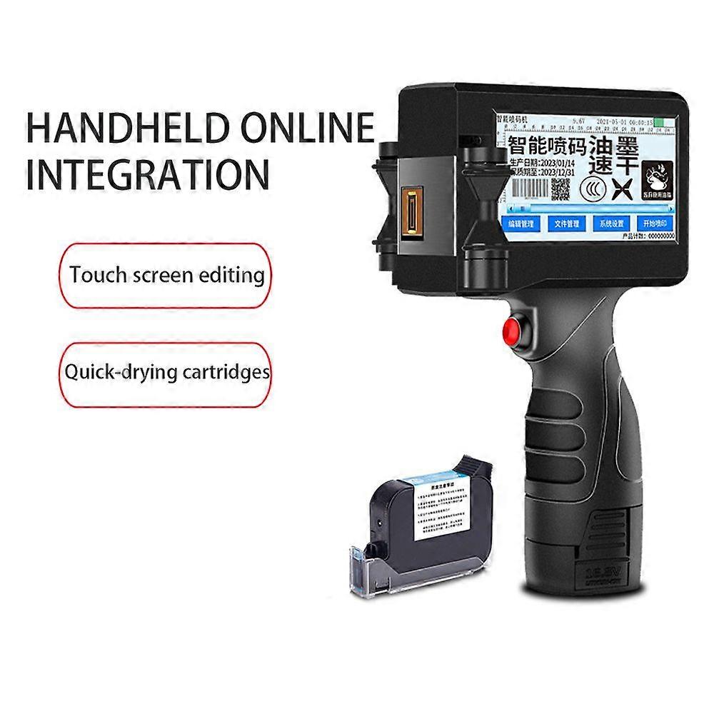 Specifications: Machine size: 240 x 100 x 130mm Weight: 522g (without ink cartridge) Screen size: 4.3-inch touch screen (100 x 58mm) Storage information: Unlimited storage space Segmentation function: Unlimited Spray accuracy: 600DPI Serial number counting: 1-9 digits Print barcode: Barcode, QR code External interface: Charging interface, USB, photoelectric interface Operating environment: Temperature 0-40C, humidity 10-80% Water color: Black Quick-drying color: Black Cartridge capacity: Universal standard ink cartridge capacity Ink properties: Dry, oily and water-based Printing paper: Synchronize machine font Spray pressure distance: 2-5mm Spray pressure height: 2-12.7mm (head 25.4mm) Spray printing speed: 50m/min at 300DPI Print content: date, quantity, batch number, serial number, images, etc. Power parameters: DC 16.8V lithium battery; 16V 2A power adapter Package contents: 1 * Inkjet printer 1 * Ink cartridge 1 * Battery 1 * Charger 1 * Positioning baffle 1 * Touch pen 1 * Data cable 1 * Thinner