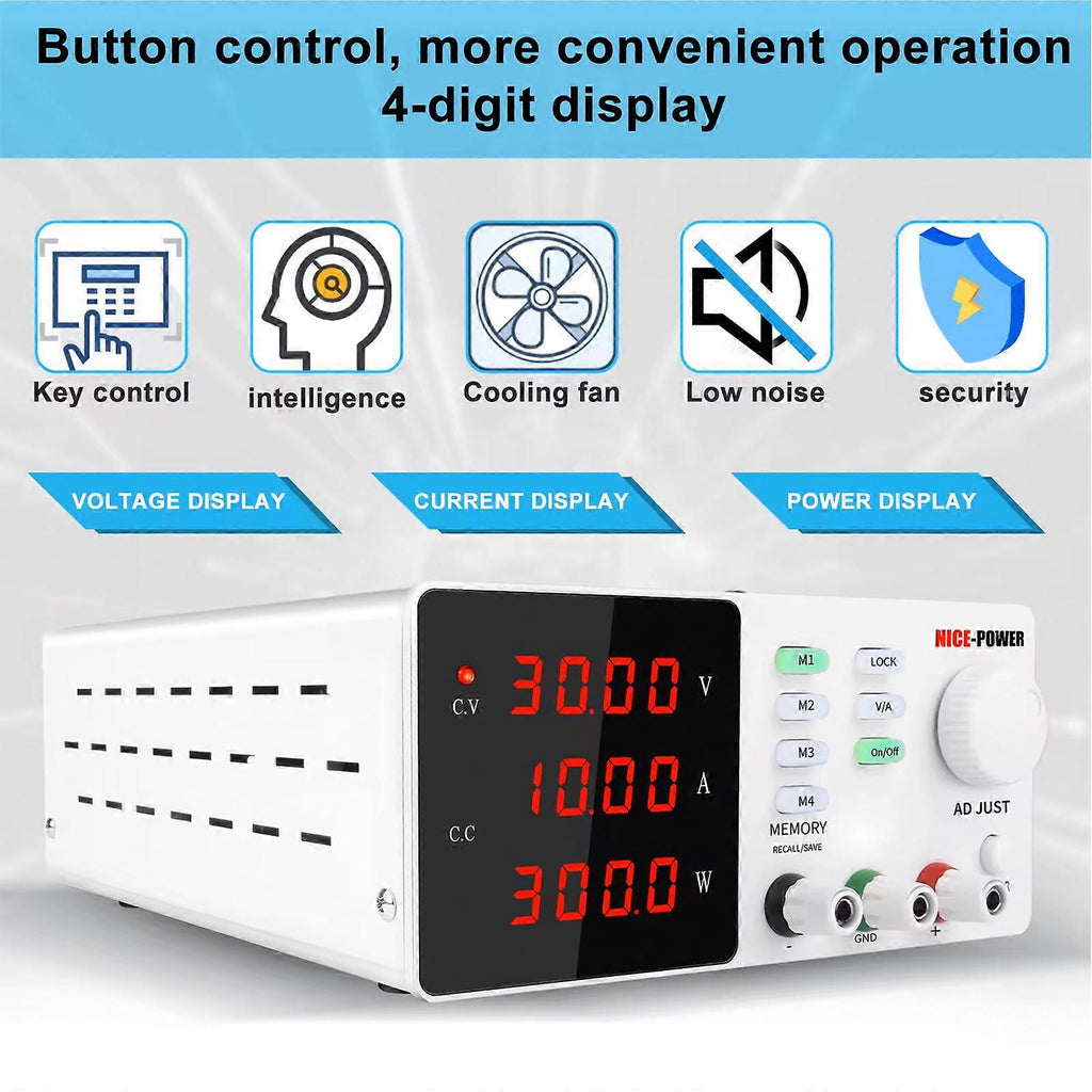 Product Description NICE-POWER SPPS-S3010 300W High Precision Adjustable Programmable 30V 10A Digital DC Power Supply Key Features: Output Power: 300W Input Voltage: 110V Output Voltage: 30V Output Current: 10A Output Type: Single Output Frequency: 50Hz Brand Name: NICE-POWER Model Number: SPPS-S3010 Product Type: Switching Power Supply Application: Testing, Repairing Certification: FCC, CE Warranty: 1 Year Protections: OCP (Over Current Protection), OVP (Over Voltage Protection) Product Description: Introducing the NICE-POWER SPPS-S3010, a 300W high-precision variable adjustable programmable DC power supply, designed to meet the demands of professionals in various industries. This lab bench power supply offers a maximum output voltage of 30V and a current of 10A, making it an ideal choice for testing, repairing, and other lab applications. Why Choose SPPS-S3010? High Precision: Achieve accurate results with the SPPS-S3010s advanced digital display and fine-tuning capabilities. Programmable Features: Easily set and adjust voltage and current parameters to suit your specific needs. Robust Protections: With built-in Over Current Protection (OCP) and Over Voltage Protection (OVP), ensure the safety and longevity of your equipment. Certified Quality: Meets FCC and CE certification standards, guaranteeing reliable and high-quality performance. Durability: Backed by a 1-year warranty, the SPPS-S3010 is designed to deliver consistent performance over time. Versatile Applications: Whether youre in a lab, workshop, or testing facility, the NICE-POWER SPPS-S3010 is the perfect tool for a wide range of applications. Its user-friendly interface and programmable settings make it suitable for both novice users and experienced professionals. Specifications: Output Power: 300W Input Voltage: 110V Output Voltage: 30V Output Current: 10A Output Frequency: 50Hz Type: Single Output Elevate your work with the precision and reliability of the NICE-POWER SPPS-S3010 300W Digital DC Power Supply. Order now and experience the difference!