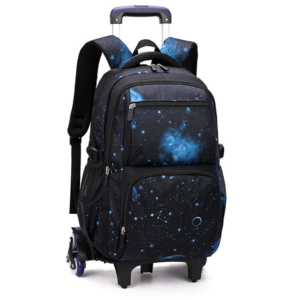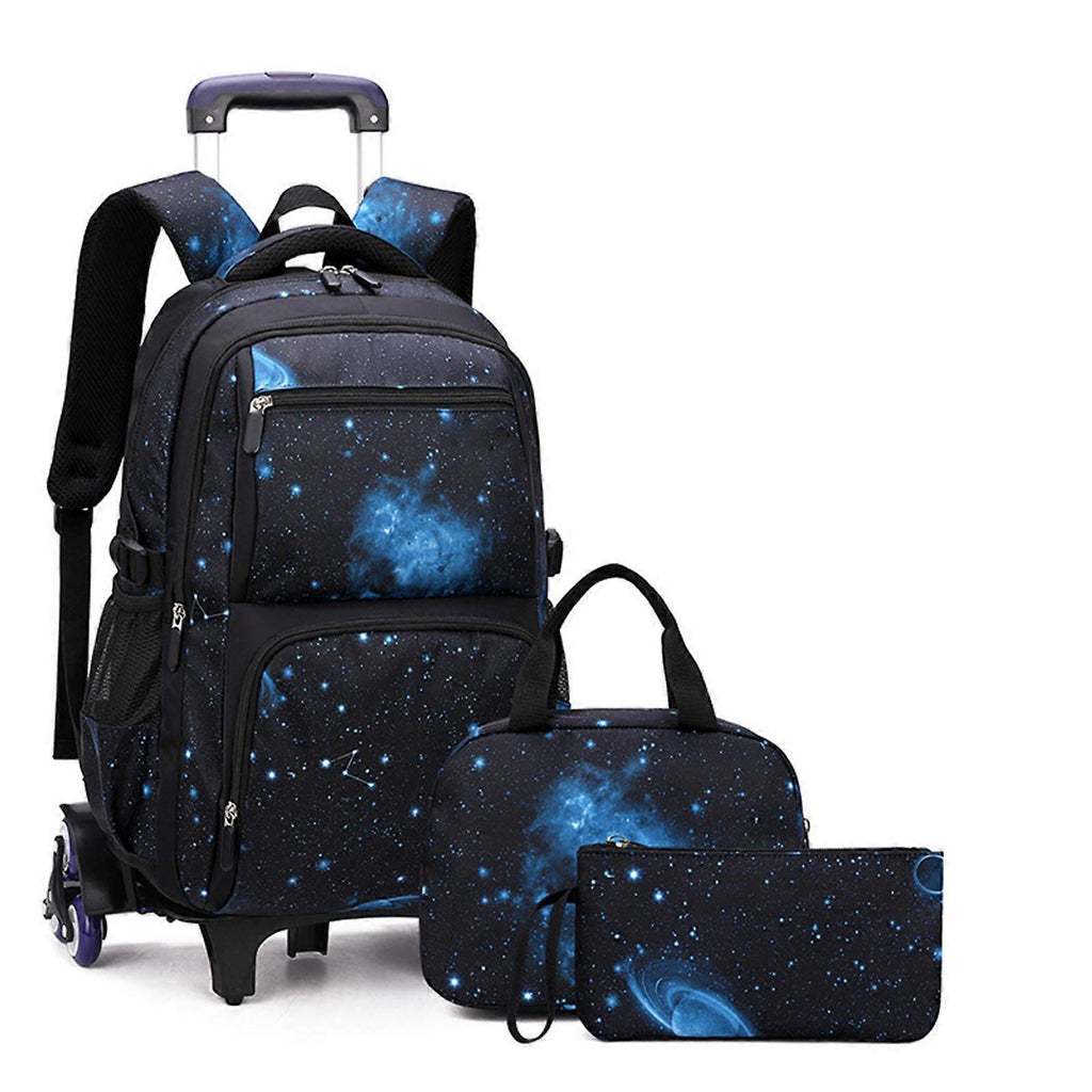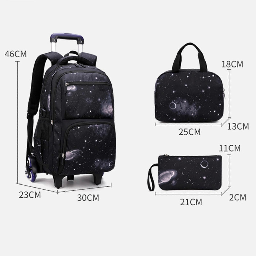 DescriptionsThis Comfortable and Multi-function Trolley Bag has Widened and thickened S-shaped breathable shoulder straps, padded back panel, and soft nylon handle, providing your child additional comfort; This boys rolling backpack set not only could be used as a trolley carry on 6-wheel design makes it much easier to climb stairs; Trolley can be separated use; Help your kids reduce load and contribute for childrens healthy growth.Features: - High Quality Material: Made from high density nylon fabric; Impeccable wear-resisting, waterproof, anti-strike and anti-scratch performance. - Comfortable and lightweight: S-shaped adjustable breathable shoulder straps; Padded back panel; Soft nylon decompression handle; Designed for alleviating weight on your back, much closer to your body. - Large capacity: Scientific and reasonable pockets and compartments design will make your daily supplies lay in the bag systematically. - Durable wheels: Noiseless wheel adopts triangle strong principle, the use of wear-resistant materials. --Easy installation of the back pull rod of the bag --The disassembly design of the backpack is user-friendly --Thread the lever through the fixed compartment on the back of the backpack to secure it --Fix the buckle at the bottom of the backpack to the pull rod socket --Easy to operate, suitable for elementary school students to go to and from school - Occasions: Daily use / school / weekend travel / outdoor sports / shopping etc. - Specifically designed for primary and middle school boys; Great gift item for your kids Specifications Type:Trolley Bag Size of Backpack: 46*23*30cm; Size of Crossbody Bag: 25*18*13cm Size of Pencil Case:21*11*2cm Color:Dark Blue, Black Blue, Pure Black Package Included: 1X Backpack 1X Trolley 1X Crossbody Bag 1X Pencil Case