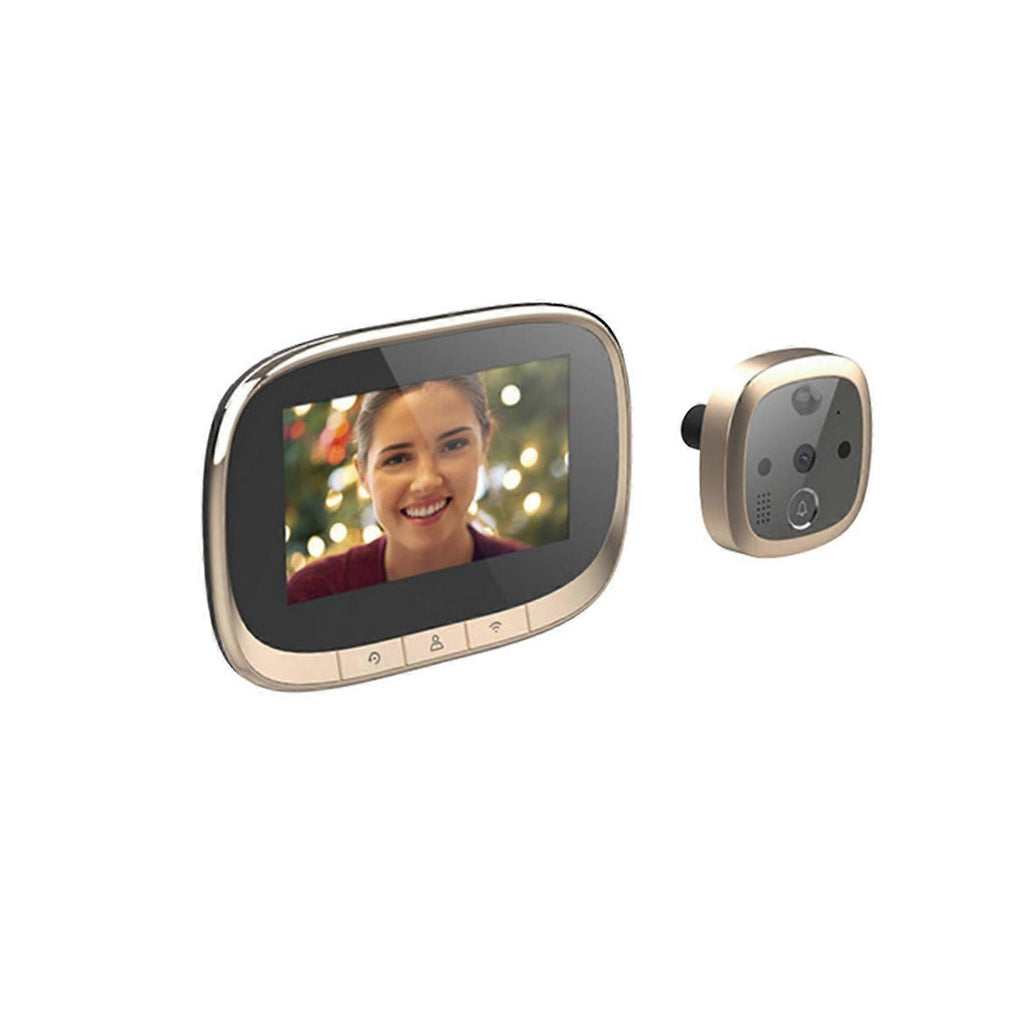 Feature: 1. The 4.3-inch super bright TFT LCD screen can display images or videos clearly and smoothly. 720P high-definition camera, high-definition image collection and recording, timely collection and recording, visitor information at a glance. 2. The 170 degree wide-angle lens provides you with a broad field of view, covering almost the entire external environment. When someone knocks on the door, make sure your family is safe before opening the door. It is widely used in villas, apartments, residences, hotels, office buildings, public buildings, etc. 3. Built-in 2 infrared LED lights with night vision function, you can clearly see the facial features of tourists even at night. Provide necessary protection at night to avoid criminal acts such as theft and vandalism. 24-hour security monitoring to protect you and your family throughout the day. 4. Support WIFI connection, mobile APP viewing, two-way voice 5. Easy to install and operate Product name: Door bell Human body sensing detection: support Storage: Maximum support 64G memory card (this link not include TF Card) Take pictures: support taking pictures Video: Support audio video, 20 seconds each time Output format: jpeg/avi Power supply: 3500 mAh battery Adapt to door hole: 14-50mm Adapt to door thickness: 30-120mm Support follow multiple languages, support volume adjustment Can take pictures, record with sound, and display time Colour:Gold Material:ABS&Metal Size: Indoor unit size: 140 x 98 x 20mm Outdoor unit size: 60 x 60mm Package Contents: 1 x Indoor Unit(Including battery) 1 x Outdoor Unit 1 x Metal Bracket 1 x Screw Kit 1 x charging cable 1 x Chinese and English manual Only the above package content, other products are not included. Note: Light shooting and different displays may cause the color of the item in the picture a little different from the real thing. The measurement allowed error is +/- 1-3cm.