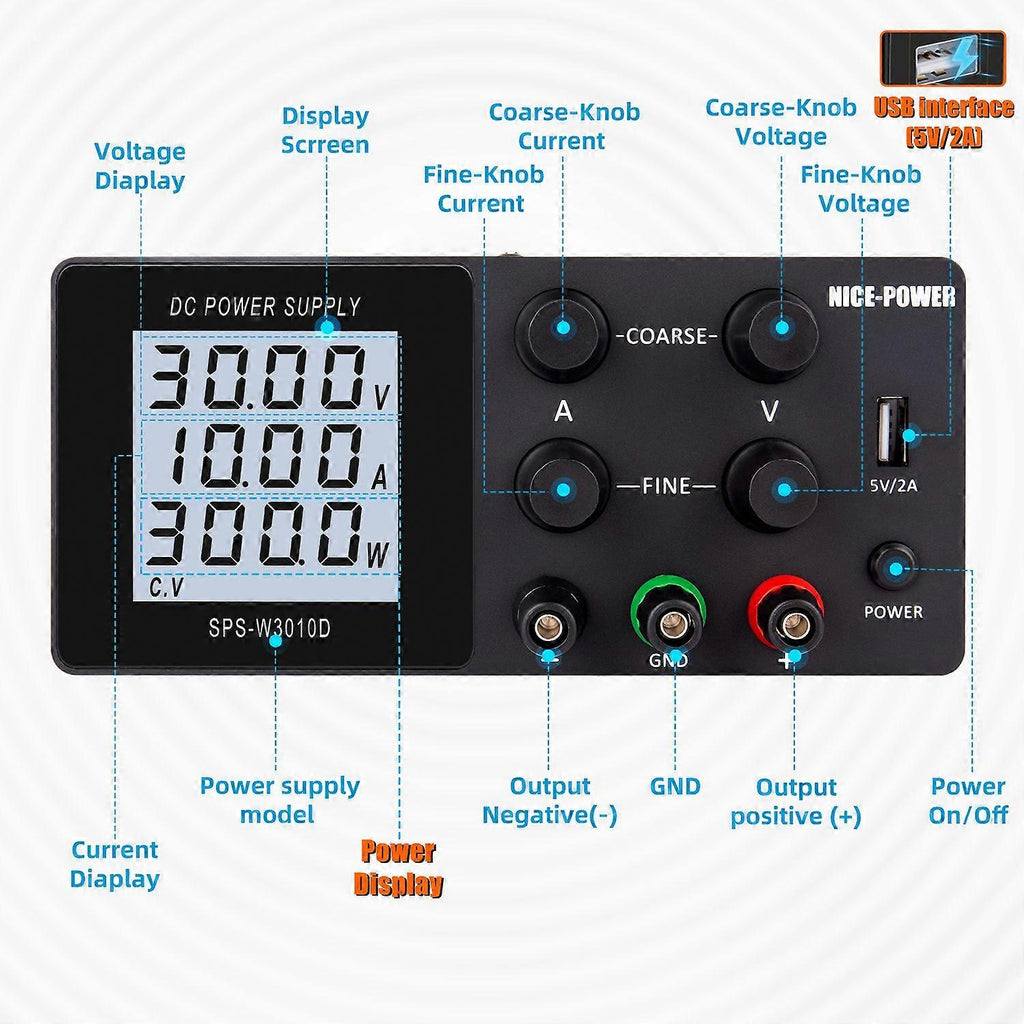 SPS-W3010D 0-30V 0-10A Adjustable Digital DC Power Supply Stabilizer Black js