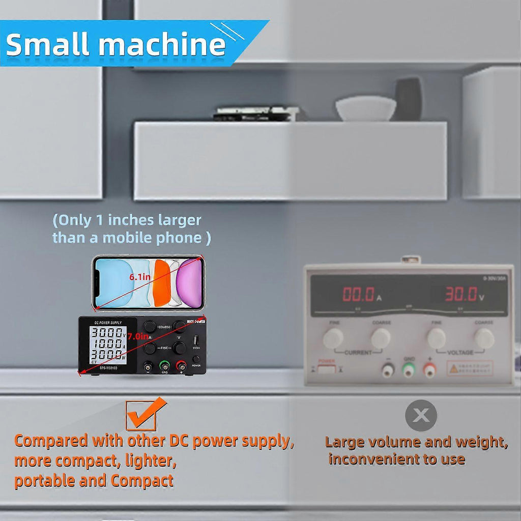 1.LCD screen, 4-digit display, with power display. 2.4 Knob potentiometer coarse adjustment + fine adjustment. 3.USB 5V 2A output port. Input voltage:AC 110V 60HZ Output voltage:0 ~ 30V Output current:0 ~ 10A Voltage resolution:10mV Current resolution:1mA Output Voltage ranges from 0 to rating voltage with continuous adjustment . Voltage regulation : Line regulation<5mV. Load regulation<5mV. Recovery time<500us(50% Load change, minimum load 0.5A) Ripple & Noise<5m Vrms, 100m Vp-p Temperature coefficient<100p pm/C. Output current ranges from 0 to rating current with continuous adjustment Current regulation line regulation<3mA. load regulation<3mA. Indicator Meter Voltage display precision: +-(0.5% of rdg + 2 digits). Current display precision: +-(0.5% of rdg + 2 digits). Operation Temperature & Humidity : 0 ~ 40 C, RH<80%. Storage Temperature & Humidity : -10 ~ 70 C, RH<70%.