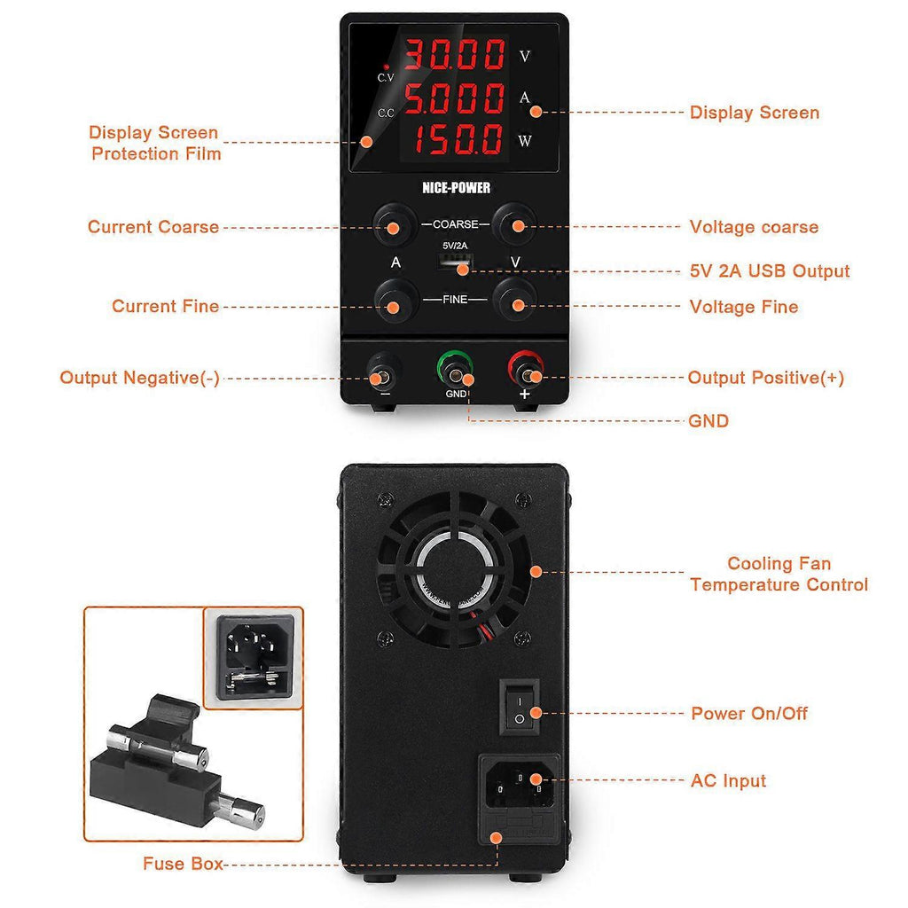 1.Automatic Power Calculation Different from other dc power supplies, dc power supply can automatically calculate the power value according to the voltage and current, but also can simultaneously display the 4-digit voltage, current and power values, numerical accuracy of 0.01V and 0.001A. 2.5V/2A USB InterfaceThe variable power supply has built-in fast charging protocol identification chip that supports USB fast charging function, which is different from the ordinary USB charging interface in that it has a 5V/3.6A output that can quickly charge your mobile phones and or other devices or be used to charge the device to be repaired. 1. High-precision LED digital display, intuitive and clear. 2.8 cm smart fan, excellent heat dissipation, effectively extend fan life and reduce noise. 3. The use of advanced technology to effectively reduce the weight of the power and convenience of mobile power. 4. A variety of protection, current limiting protection (OCP), over temperature protection (OTP), Over Power Protection (OPP). 5. plastic panels, more beautiful, voltage, current, coarse and fine adjustment knob to set the settings to be more precise. Application areas: . Car DVD, Car Audio. . Aging products, such as resistors, capacitors, relays, DC motors, LED and the like. Laboratory, factory, repair power supply. Other DC power supply all the needs of the occasion. Technical parameters: 1. Input voltage: 110V 10% @ 60Hz 5Hz Switch or a single voltage input 2. Output voltage: DC 0- 30V 3. Output Current: DC 0- 5A 4. Display Accuracy: 1% 1 word (three / three and a half digital display, voltage resolution 0.1V, current resolution 0.1A) 0.1% 1 word (four / four semi-digital display, voltage resolution 0.01V, current resolution 0.01A) 5. boot delay: 1-2S Shutdown Delay: 1-6S (depending on the load) 6. Voltage Stability: 0.05% + 1mV 7. The current stability: 0.1% + 10mA 8. Load stability: CV0.05% + 1mV CC0.05% + 10mA 9. Ripple and Noise: CV10mV CC20mA (RMS) 10. Overall efficiency: 80% (under full load test) 11. Working environment: -10 - + 40 Relative humidity 20% -80% (non-condensing) 12. Storage Environment: -20 - + 80 Relative humidity 20% -70% (non-condensing) 13. Pressure test: Input - Output: 1.5KVAC / 1 Minute Input - Housing: 1.5KVAC / 1 Minute Output - Housing: 500VAC / 1 Minute 14. Ground Resistance: <20m