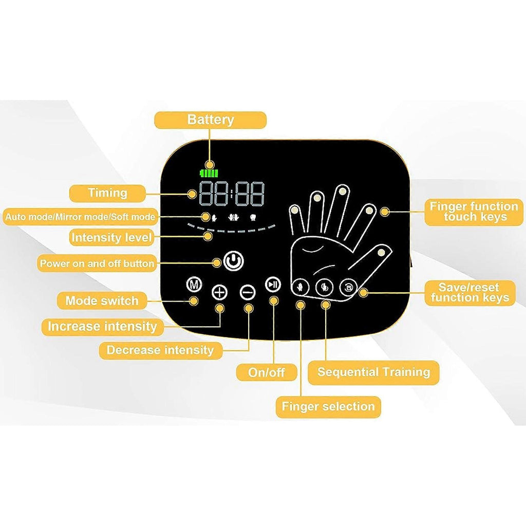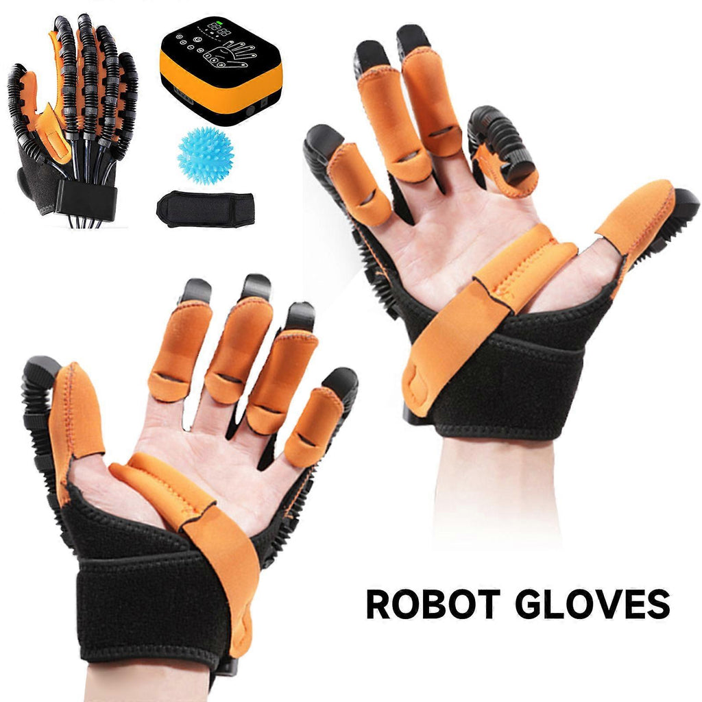 About rehabilitation robot gloves: It is a robot gloves for hand function rehabilitation and hand exercise, which is used for patients with hand or finger dysfunction. For example, patients with stroke, hemiplegia, cerebral palsy, cerebral infarction, cerebral haemorrhage, parkinson's disease or nerve injury. It can solve these problems for patients: 1. Help stroke and cerebral palsy patients with hand function rehabilitation training. 2. Help individuals/families without professional rehabilitation equipment to save on the high costs of medical institutions. 3. Help patients save time on comprehensive training in hospitals. 4. Reduce the workload of therapists in rehabilitation centers. Previously, these movements had to be manually completed by professional rehabilitation therapists, but now these mechanical movements can be completed by gloves and programs, which usually reduces the workload of therapists. Rehabilitation Robot Glove Rehabilitation robot gloves will be your best gift choice for family and friends. Flexible hand training/promoting blood circulation/solving hand stiffness. Multiple training modes will be a good helper to promote your hand rehabilitation. Small and portable design, you can keep training anytime and anywhere. This product has been tested and obtained CE, FCC, and RoHS certifications. Key Functions Auto Mode Continuous stretching and squeezing motion training. 8-intensity level. Mirror Mode Glove hand follows the motion of the strap hand When strap hand squeezing (touching the click button), the glove hand will follow to squeeze, so does stretch motion. Mirror Mode You can also use the Mirror mode to practice squeeze/hold/release objects. Individual Finger Training You can train 1/2/3/4/5 fingers individually without tuning valves. This is an all in one, easy to use machine. Follow step 1 and step 2 to put on the glove. If mirror mode training, refer step 3. User Interface with LED Display Product details Product Parameters This product is an upgraded version of rehabilitation gloves. Name: rehabilitation robot gloves Function: hand function recovery Materials: reinforced hardened resin fiber, PC/ABS alloy, PVC, stainless steel, rubber. Product Model: RRG-100 Rated voltage: 13.5v Input voltage current: 2A Modes and speeds: 3 modes and 8 speeds Size: (left or right hand) S,M,L,XL Color: Orange Host size: 6.7*5.5*3.14 in Net weight: 4 lb Air pressure range: negative pressure o80kpa, positive pressure 150kpa. Precautions: Please check the Power Section is broken before use; Do not plug in the power part with wet hands; More detailed precautions see user manual Packing list: 1* Beautiful Packaging box 1* Main unit 2*Rehabilitation Robot glove (Left near right hand) 1* Mirror training bracelet 2* Rubber ball 1* Manual 1* Charger with adapter