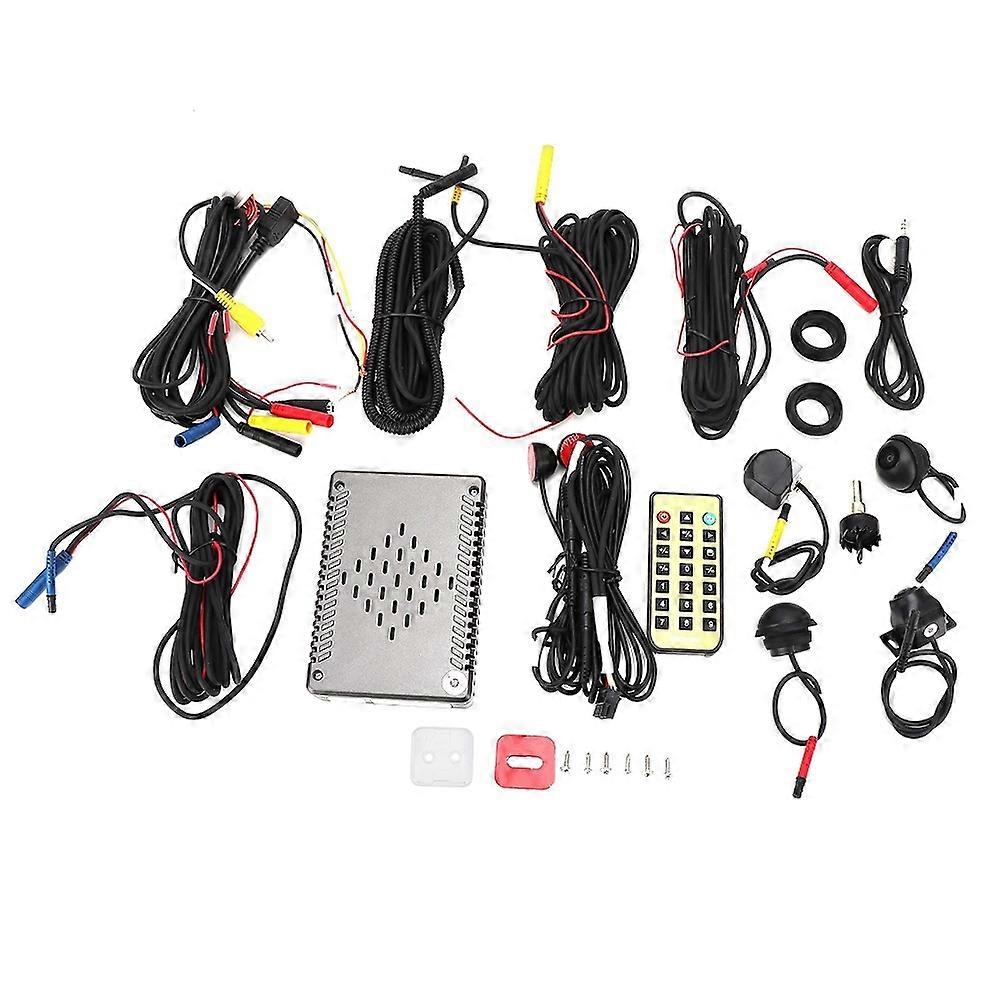 Features: Support high/low voltage power failure protections to guarantee the safety of the vehicle owner. Support parking stop delay video recording, support vibration recording(optional). Support motion detection function, the host will automatically record once sensing someone's illegal invasion. Panoramic image and navigation system realize fast switching and background program playback at the same time. Panoramic image can achieve local monitoring screen zoom function. External U disk,ultra long panoramic video memory, convenient for users to carry around. Independent four-way display function, records panoramic images, automatically switches display when steering and reversing. Installation without correcting camera, automatic splicing and automatic calibration function, support one-click splicing. Images can appear after 3 seconds cold boot reversing, completely replacing the traditional rear view. Panoramic monitoring and recording image controllable playback function allows the travel scenery to be preserved forever, and it is also convenient for instant evidence collection. Image technology: Advanced fish-eye image correction and transformation technology, stitches images naturally. Users of this system can upgrade the latest program at any time through the USB disk. Specification: Condition: Material: Aluminum alloy Color: Black Camera: Image sensor: PC1099 Optical size:1/3 inch Pixel pitch: 5.0*7.4um Pexel: 1.2MP Horizontal resolution: 580 TV lines Video format: NTSC Dynamic range:>72db S/N ratio: >48db Minimum illumination: 0.1 Lux View angle: 170?? Video output: 1.0V& 75?? Memory card: TF card Data storage capacity: Up to 32G Data storage time: Loop recording Data transfer interface: USB, AV, USB/HDMI Placement on vehicle: Front windshield Power supply: 12V-24V Weight: Approx.900g/31.7oz Package List: 1 x Control Host 4 x Camera (Front, Rear, Left, Right) 4 x Camera Extension Cord 1 x Wire Harness 1 x Video Output Cable 1 x Infrared Receiver 1 x Remote Controller 1 x Trapper 1 x User Manual 1 x Installation Kit