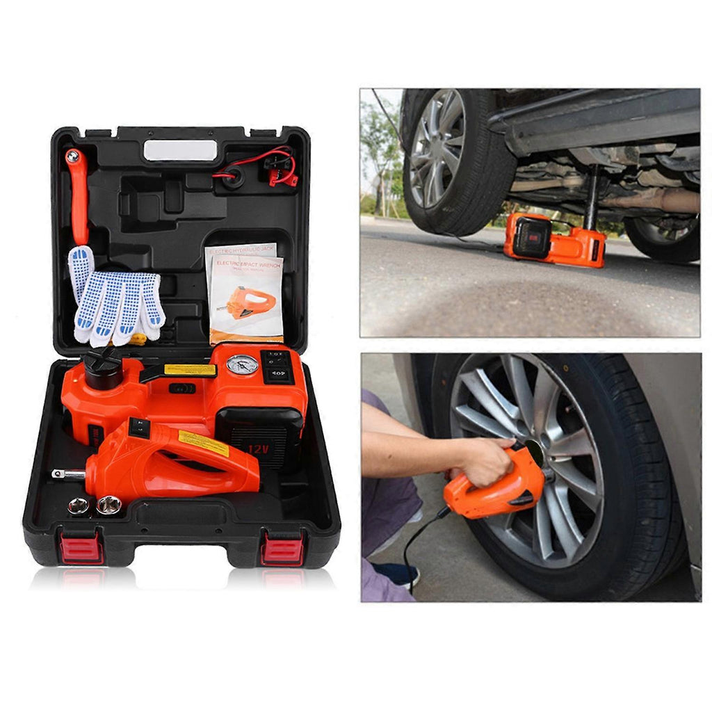 Compact size equipment stores in car for emergent roadside tire change and repair.