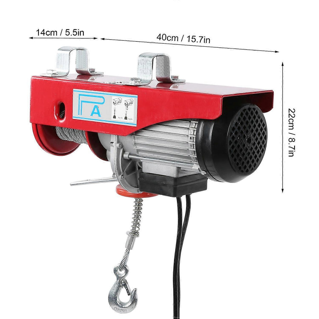 Feature: 1. With a load capacity of 1100LBS, the garage hoist can easily lift small engines, gearboxes, large workshop tools or construction supplies. 2. There are 2 lifting modes, single line capacity is 250 kg/550 lb, 10 m/min (32.8 ft/min), double line capacity is 500 kg/1100 lb, 5 m/min (16.4 ft/min) 3. Rust?proof and wear?resistant, the overall structure is made of cast iron and aluminum, and the high?carbon steel cable can be lifted firmly. 4. Wide range of applications, suitable for factories, warehouses, construction, railway construction, industrial and mining enterprises, etc. 5. Wired remote control is realized by the handle switch installed on the machine through the cable. The cable length is about 1 m, allowing you to operate within a safe distance. 6. Limit switches have been installed to reduce swing and prevent the chain from exceeding. Specification: Item Type: Electric Cable WinchHousing Material: Cast iron and aluminum Voltage: 220V Power: 1020W Rated Lifting Weight: 500KG (1100 lbs) for dual lines, 250KG (550 lbs) for single lines Single Row Height: Approx. 18meter / 59.1ft Double Line Height: Approx. 9meter / 29.5ft Single Line Hoisting Speed: Approx. 10 meter / min (32.8 ft / min) Double-Line Lifting Speed: Approx. 5 meter / min (16.4 ft / min) Wire Length: Approx. 18meter / 59.1ft Remote Control Cable Length: Approx. 1.0meter / 3.3ft Power Cord Length: Approx. 0.4meter / 1.3ft Cable Specification: Approx. 5mm / 0.2inSize: Approx. 22cm / 8.7in14cm / 5.5in 40cm / 15.7in . Package List: 1 x Electric Cable Winch1 x Hook2 x Bracket4 x Screw4 x Screw Washer1 x User Manual