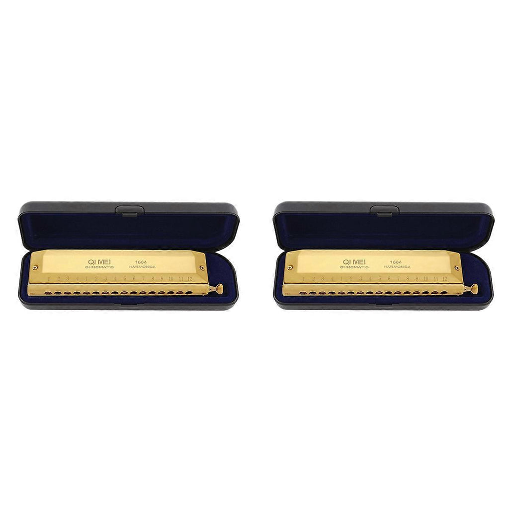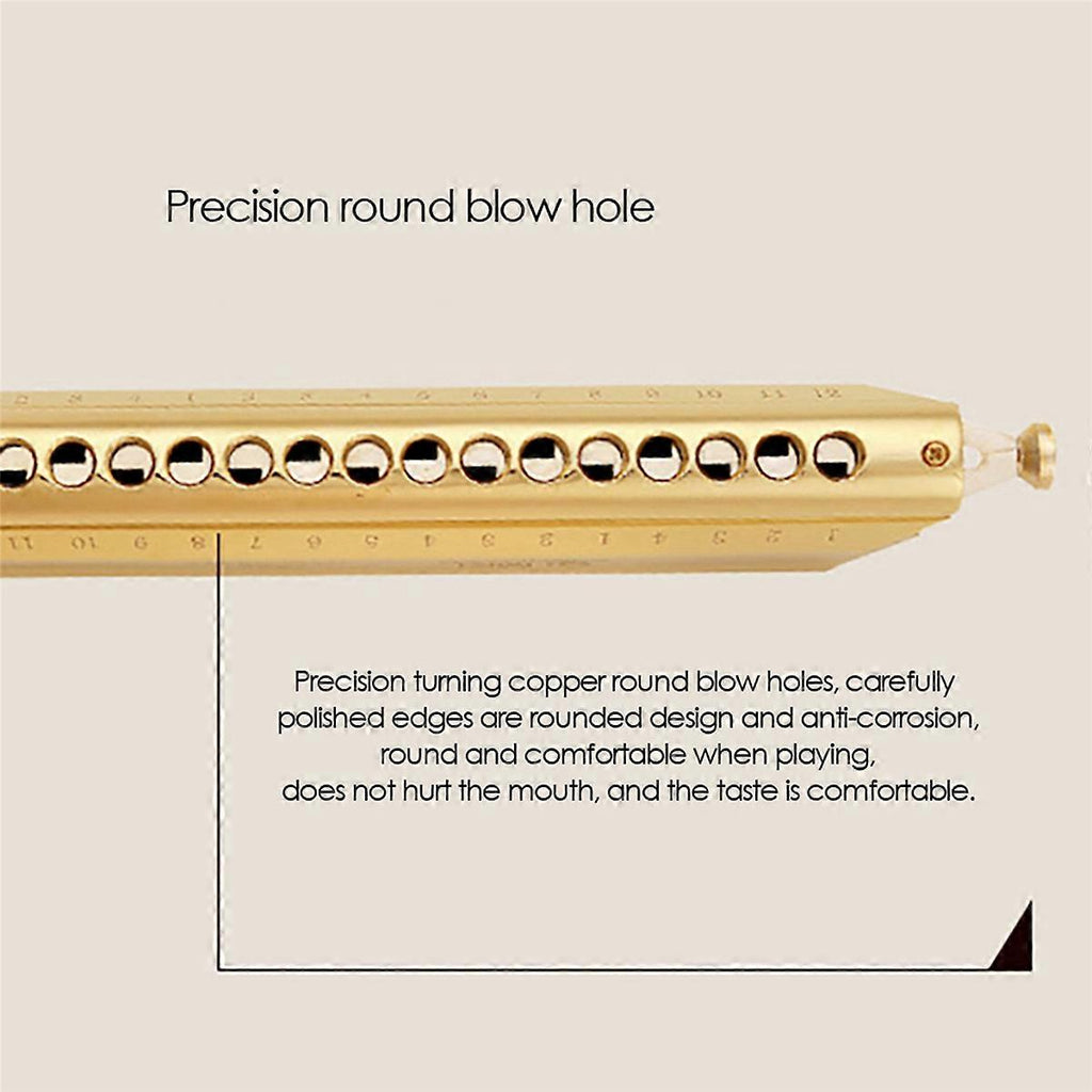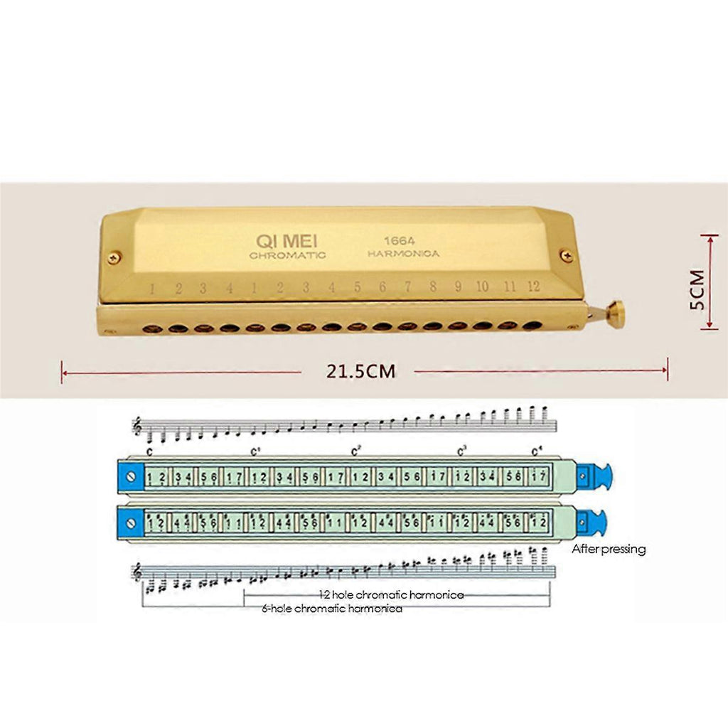 Tone: C Number of Bores: 16 Pronunciation Method: Chromatic Type: Chromatic Harmonica Model Number: QM-16A The following are a few tips for taking care of your harmonica: 1. Don't drink sticky, heavy drinks before playing. 2.Keep your harmonica in or in some other clean place if you are not playing. 3.Rinse your mouth out well, wash your hands, or brush your teeth if necessary, before playing the harmonica. 4.Tap your harmonica out gently after playing, tapping out the excess saliva - holes down. 5.Don't let others play your harmonica - unless it is someone you don't mind kissing. 6.Keep your harmonica away from heat or direct sunshine. 7.Do not wash your harmonica with hot water, alcohol or other chemicals. Name: colour:Golden Material:Metal+ABS size:21.5 x 5cm Package Contents: 2 x Harmonica Only the above package content, other products are not included. Note: Light reflection and different displays may cause the color of the item in the picture a little different from the real thing. The measurement allowed error is +/- 1-3cm.