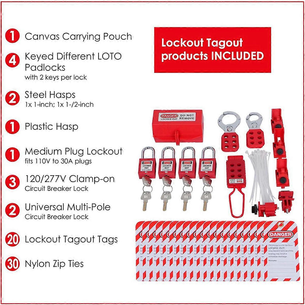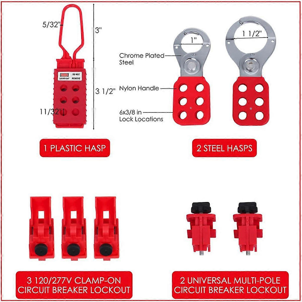 Lockout Tag Kit: Kit contains of versatile lockout devices stored in a ripstop polyester canvas carrying case, developed and tested to proper control of hazardous energy sources Security Padlocks: 8 red keyed different lock mark locks with 2 keys each. Non-conductive thermoplastic one-piece, - stainless steel shackle, key retention brass core cylinder Locking devices: 6 pieces 120/277V clamp-on circuit breaker lockout, 4 pieces universal multi-pole circuit breaker lockout, 2 medium plug lock (for 110V to 125 V / 30A plugs) Buckles and Tags: 4 locking buckles (1 inch and 1 1/2 inch inner jaw diameter), 2 polypropylene plastic buckle, 40 locking tags, 2 red canvas tote and 60 nylon zipper straps material: metal Color as shown Package Contents: 2 Set big easy lockout kit Only the above package content, other products are not included. Note: Light reflection and different displays may cause the color of the item in the picture a little different from the real thing. The measurement allowed error is +/- 1-3cm.