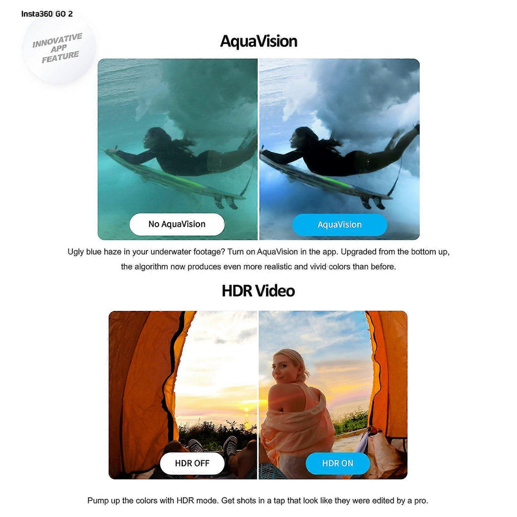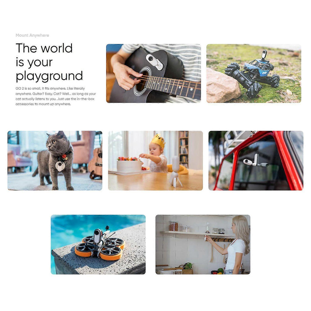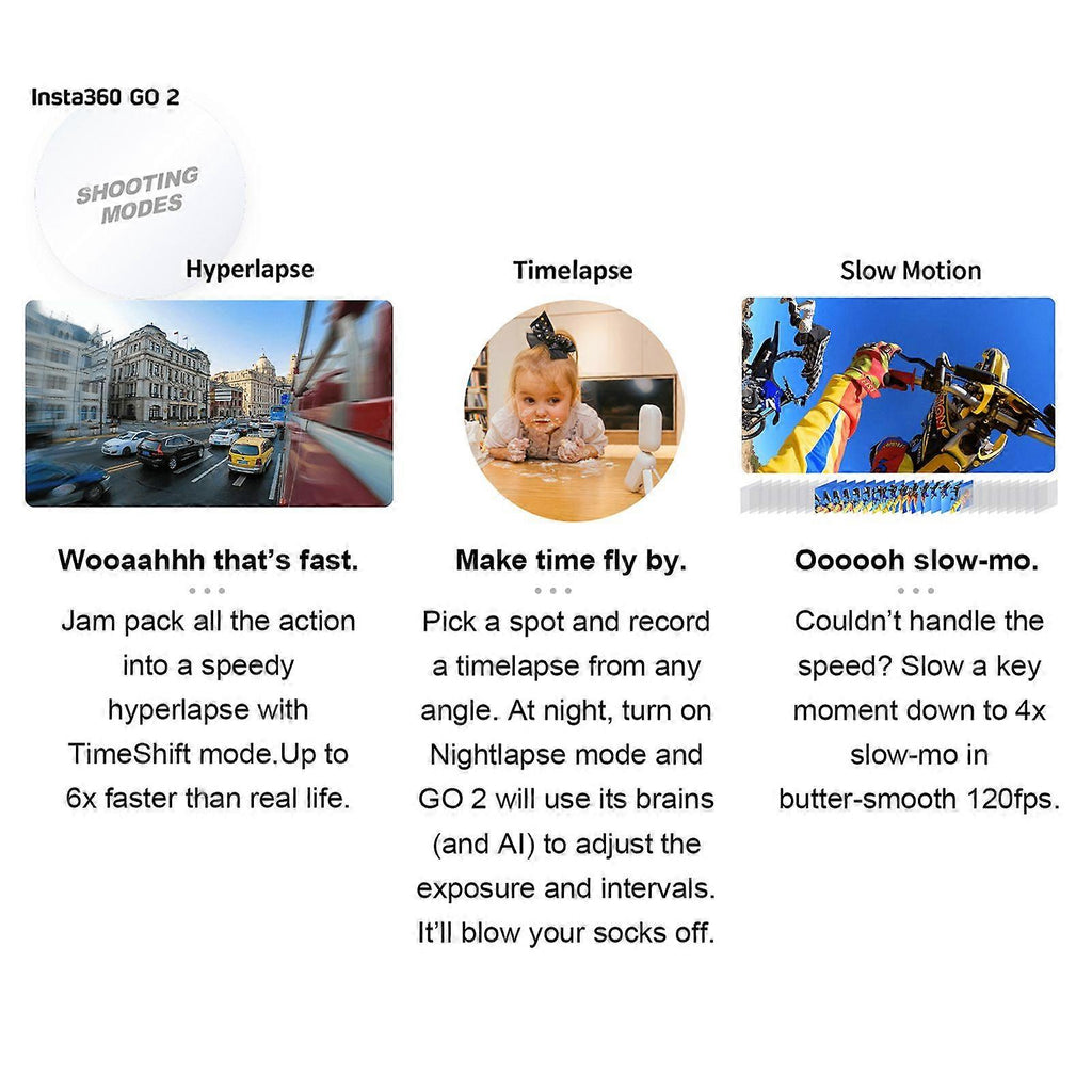Feature:1. Tiny But Mighty Insta360 GO 2 is the world\u0027s smallest action camera. It weighs about 6X lighter than your old action came. With the 1/2.3 inch image sensor, can record 1440P 50fps smooth and clear videos; supports 4 meters IPX8 waterproof with lens guard.2. Mount Anywhere GO 2 is so small, it fits anywhere. Guitar? Easy. Cat? Well...as long as your cat actually listens to you. Just use the in-the-box accessories to mount up anywhere and captures the best moments of your life.3. Smooth and Amazing Shooting EffectsFlowState stabilization will keep your shot steady no matter anywhere you mount GO 2; Horizon lock can perfectly level horizons; slow motion function can slow a key moment down to 4X slow-mo in super smooth 120fps.4. Hyperlapse \u0026 TimelapseJam pack all the action into a speedy hyperlapse with TimeShift mode. Up to 6X faster than real life. Pick a spot and record a timelapse from any angle. At night, turn on Nightlapse mode and GO 2 will use its brains(and AI) to adjust the exposure and intervals.5. More Than a Charge CaseGO 2\u0027s charge case does more than you think. It is a case, charger, controller and tripod all in one. As a charger, it can charge up in just half an hour and shoot for up to 2.5 hours; you can use it to control the camera from 10M away; it can also work as a mini tripod or a handheld selfie stick.Specification:Features:Tiny But MightyInsta360 GO 2 is the world's smallest action camera. It weighs about 6X lighter than your old action came. With the 1/2.3 inch image sensor, can record 1440P 50fps smooth and clear videos; supports 4 meters IPX8 waterproof with lens guard.Mount AnywhereGO 2 is so small, it fits anywhere. Guitar? Easy. Cat? Well...as long as your cat actually listens to you. Just use the in-the-box accessories to mount up anywhere and captures the best moments of your life.Smooth and Amazing Shooting EffectsFlowState stabilization will keep your shot steady no matter anywhere you mount GO 2; Horizon lock can perfectly level horizons; slow motion function can slow a key moment down to 4X slow-mo in super smooth 120fps.Hyperlapse & TimelapseJam pack all the action into a speedy hyperlapse with TimeShift mode. Up to 6X faster than real life. Pick a spot and record a timelapse from any angle. At night, turn on Nightlapse mode and GO 2 will use its brains(and AI) to adjust the exposure and intervals.More Than a Charge CaseGO 2's charge case does more than you think. It is a case, charger, controller and tripod all in one. As a charger, it can charge up in just half an hour and shoot for up to 2.5 hours; you can use it to control the camera from 10M away; it can also work as a mini tripod or a handheld selfie stick.Specifications:Brand & Model: Insta360 Go 2Video Resolution:FlowState Stabilization(pro video mode)-- 2560 * 1440 at 50fps/30fps, 1920 * 1080 at 50fps/30fps;Timelapse-- 2560 * 1440 at 30fps, 1920 * 1080 at 30fps;Basic Stabilization(video mode)-- 2560 * 1440 at 50fps/30fps, 1920 * 1080 at 50fps/30fps;TimeShift-- 2560 * 1440 at 30fps, 1920 * 1080 at 30fps;HDR-- 2560 * 1440 at 25fps/24fps, 1920 * 1080 at 25fps/24fps;Slow Motion: 1920 * 1080 at 120fpsPhoto Resolution: 16:9 2560 * 1440, 9:16 1440 * 2560, 1:1 2560 * 2560, film panorama 2938 * 1088Video Format: MP4Photo Format: INSP/ DNGPhoto Modes: standard, interval, starlapse, night shotVideo Modes: video(badic stabilization), pro video(flowstate stabilization), HDR, timelapse, timeshift(hyperlapse), slow motionVideo Coding: H.264Max. Video Bitrate: 80MbpsBLE: BLE 5.0White Balance: Auto, 2700K, 4000K, 5000K, 6500K, 7500KAperture: F/2.2ISO: Auto, 100-3200Charge Interface: Type-CMemory Capacity: 32GBUsage Temperature: -10 to 40Camera Size: 52.9 * 23.6 * 20.7mm/ 2.08 * 0.93 * 0.8inCamera Weight: 26.5g/ 0.93ozCharge Case Size: 68.1 * 48.54 * 26.5mm/ 2.68 * 1.91 * 1.04in (closed)Charge Case Weight: 63.5g/ 2.24ozNote:Users can download APP by scanning the OR code on users manual.Package List:1 * Insta360 Go 2 Camera with Lens Guard1 * Charge Case1 * Charge Cable1 * Magnet Pendant1 * Easy Clip1 * Pivot Stand1 * Quick Start GuidePackage List:1 * Insta360 Go 2 Camera with Lens Guard1 * Charge Case1 * Charge Cable1 * Magnet Pendant1 * Easy Clip1 * Pivot Stand1 * Quick Start Guide