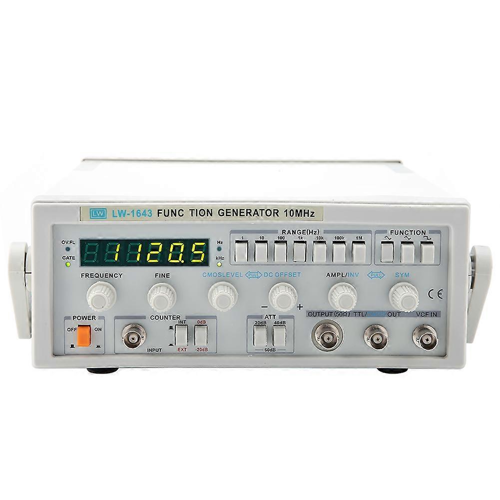 Features:1. The frequency can be selected, 0.1Hz-2MHz, 5 MHz, 10MHz, 15MHz2. Output waveform includes sine wave, triangle wave, square wave, ramp wave, forward or negative pulse wave, sawtooth wave, etc.3. TTL/CMOS and OUTPUT synchronous output.4. Less than 1% distortion at 10Hz-100KHz.5. Less than 0.5dB frequency response at 0.1Hz-100 KHz.6. Frequency counter is from 1Hz to 30MHz.Specification:Condition: Model: LW-1643Frequency: 0.1Hz-10MHz Output Impedance: 50ohm10%Amplitude: Not less than 20Vp-p (no load) Symmetry Range: 90:10--10:90 Rising Edge Of Square: Less than 35nsDistortion: Less than 1% at 10H-100KHz Frequency Response: 0.1Hz~100MHz: 0.5dBLevel: TTL low level less than 0.4V in pulse wave, high level less than 3.5V,CMOS low less tan 0.5V in pulse wave, high level 5V--14V continuously variable. Rising Time: Less than 100ns Max.Volt-Controlled: 1000:1 Input Signal: DC-1KHz Measuring Range: 1Hz~10MHz10Vp-pInput Impedance: Not less than 1Mohm/20F Sensitivity: 100mVrms Max. Input: 150V(AC+DC) Input Attenuation: 20dB Accuracy: Less than 0.003%1 digitWeight: Approx. 3600g / 127.0ozSize: Approx. 270 * 225 * 90mm / 10.6 * 8.9 * 3.5inPackage List:1 * Function Signal Generator1 * BNC Connect Cable1 * BNC Turn Crocodile Clip Cable2 * Fuses1 * User Manual