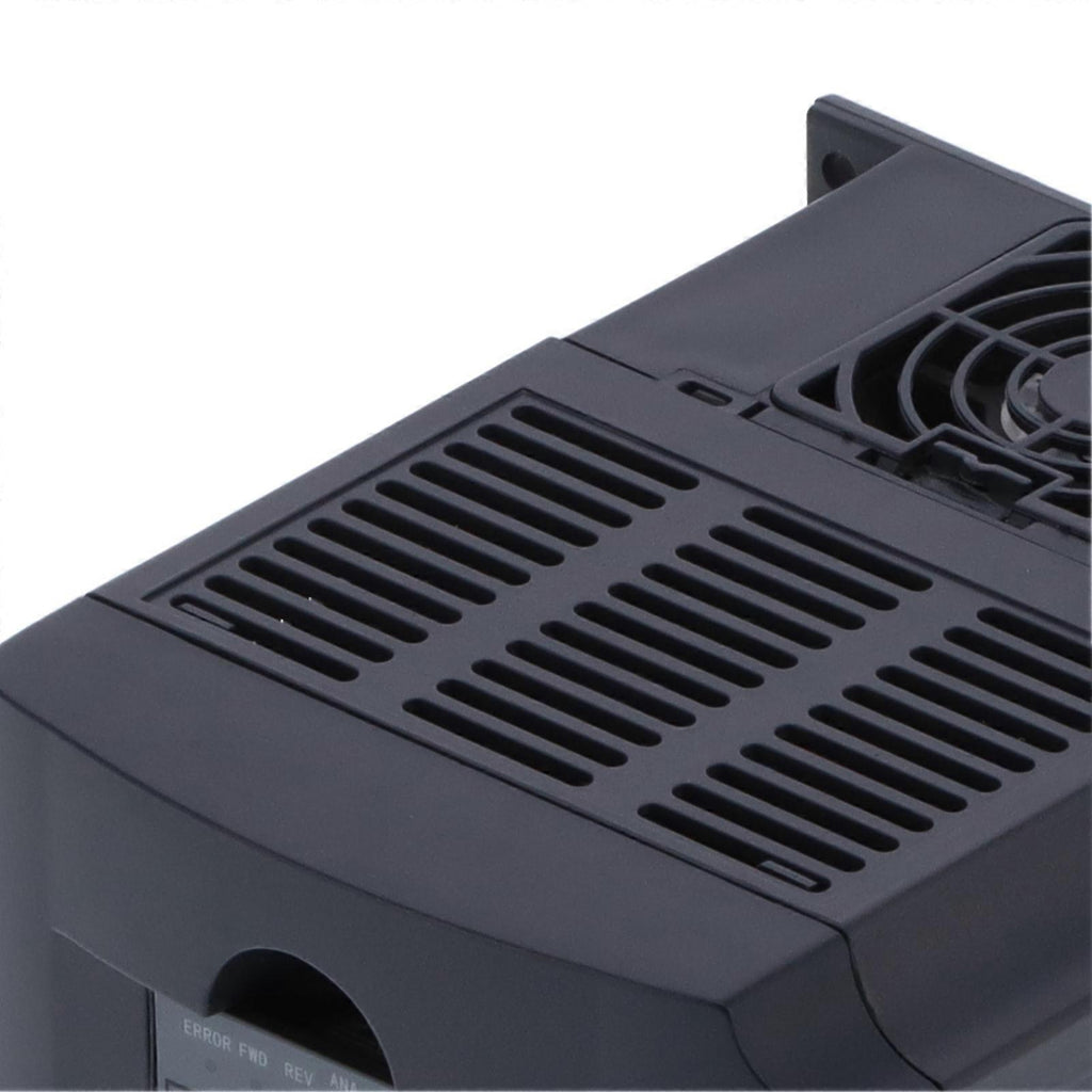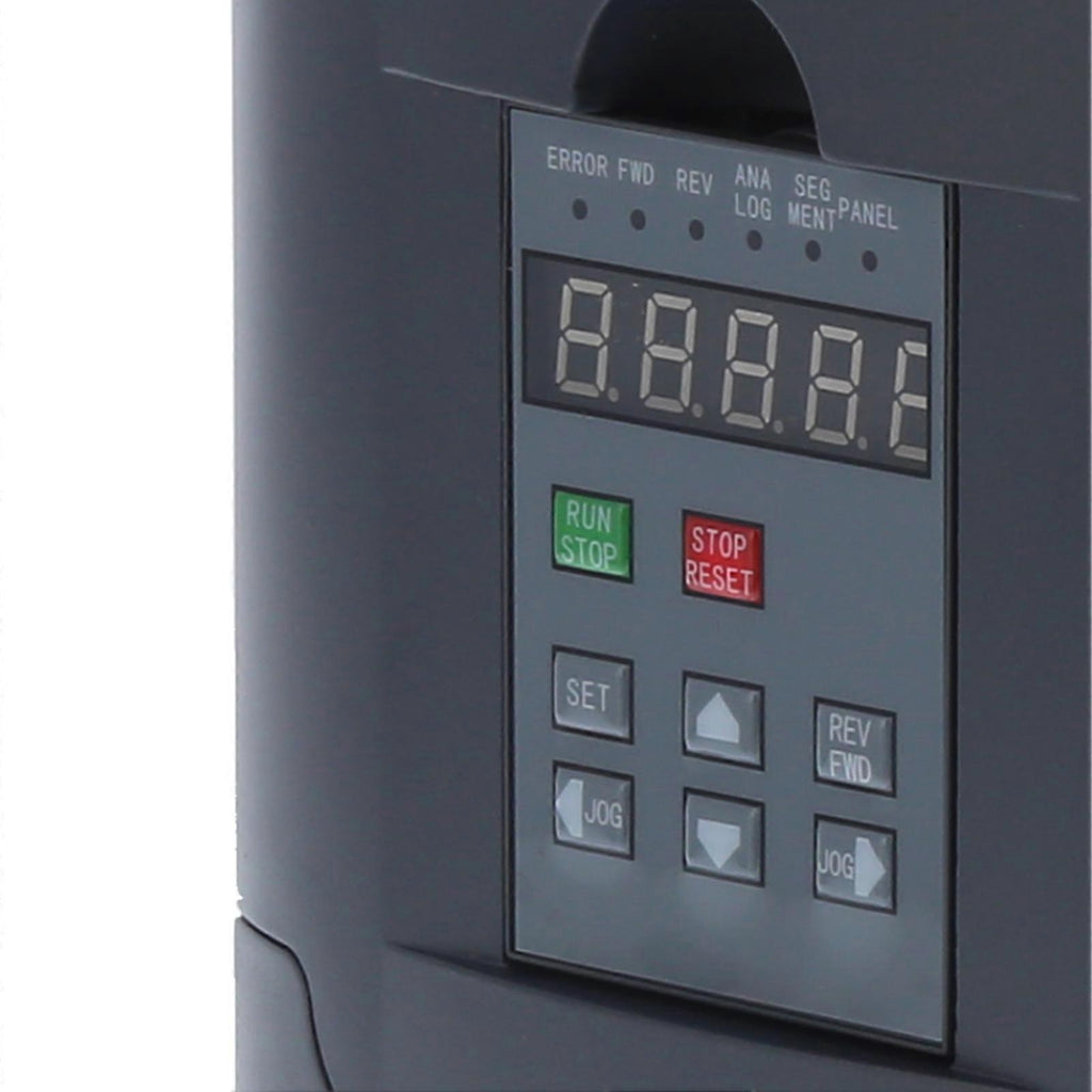 Feature:1. The inverter shell is made of industrial flameretardant ABS plastic, which has good heat resistance and impact resistance.2. Comprehensive functions, with common functions of current mainstream inverters, suitable for a variety of occasions.3. Humanized keyboard design, clear digital screen display, convenient operation and realtime understanding of running status.4. Super all aluminum base heat sink combined with imported powerful fan, super wind power and good heat dissipation effect.5. With frequency and acceleration deceleration control and multiple protection functions, it is widely used in machine tool equipment, automation equipment and other fields.Specification:Item Type: Variable Frequency DriveModel: A2-3075Power 7.5KWInput: 3-phase 300-460V current 20AInput Frequency: 40-60HZOutput: 3-phase AC380V current 30AOutput Frequency: 0-400HZMotor Control MethodKey Operation Instructions:RUN/STOP: When the inverter is in idle state, press this key and the inverter will start running, and when it is pressed again, the inverter will stop running.STOP/RESET: When the inverter is running, press this key and the inverter will stop running. If the inverter is in a fault state, press this key to reset the inverter. In the menu setting, press this key to return to the previous menu.REV: Press this key to reverse the running direction of the inverter. It is also effective at runtime.SET: Press this key to enter the menu setting. If it is in the menu item, press this key to save the menu parameter and enter the next menu item.: Menu item selection and subitem data modification.: Menu item content modification shift and panel jog button.Panel potentiometer: The operating frequency is given by the panel potentiometer.Display Window ContentMeaning of Display Status:ERROR: Inverter fault indicator. When the light is on, it indicates that the inverter is abnormal.FWD: Forward rotation status indicator, when the light is on, it indicates that the inverter is running forward.REV: Reversal status indicator, when the light is on, it means the inverter is reversed.ANALOG: Analog reference indicator, when the light is on, it means that the running frequency comes from the analog quantity.SEGMENT: The segment speed setting indicator, when the light is on, it means that the running frequency comes from the segment speed.PANEL: Panel control indicator, when the light is on, it means that the running signal is given by the panel.Digital tube: Indication of inverter operating frequency. The nixie tube flashes when the inverter stops, and the actual value is the given frequency of the inverter. The display data during frequency operation is determined by the "Pn01" data.Motor Control MethodSpace voltage vectorInput Power380V, power supply: 300-460V5-Digit Digital Display and Status IndicatorDisplay frequency, speed, CW and CCW, fault, etc.Communication ControlRS-232Operating Temperature-10-50Humidity20-95% relative humidity (no condensation)Vibration0.5G or lessFrequency ControlRange0.10-180.00HzAccurayDigital type: 0.01% (-10-50); analog type: 0.1% (2510)Set ResolutionDigital: 0.01Hz; Analog: 1% of the maximum operating frequencyOutput Resolution0.01HzKeyboard Setting MethodCan be set directly by Analog Setting MethodExternal voltage 0-5V, 0-10V, 0-20mAOther FunctionsFrequency lower limit, start frequency, can be set separatelyGeneral ControlAcceleration and Deceleration ControlAcceleration and deceleration time (0.01-650.00 seconds) arbitrarily selectedV/F CurveV/F curve can be set arbitrarilyTorsion ControlTorsion boost can be set, the maximum 200.0% starting torsion is at 1.0HzMulti-Function Input6 multi-function input terminals, realize 8-speed control, UP, DOWN function, external operation and otherMulti-Function OutputA multi-function output terminal, can realize the indication and alarm during operation, frequency arrival, external abnormality, etc.Other FunctionsDeceleration stop or free stop, DC brake, automatic reset and restart, etc.Protective FunctionOverload ProtectionDrive (constant torsion 250%/1 minute, fan type 200%/1 minute)FUSE ProtectionFUSE blown, motor stoppedOvervoltageDC voltage800VUndervoltageDC voltage280VMomentary Power Failure RestartMomentary power failure restartOutput Short CircuitElectronic circuit protection, U, V, W output short circuit protectionOther FunctionsHeat sink overheat protection, reverse rotation limit, direct start and fault reset function after power-on, parameter lock, etc..Package List:1 x Variable Frequency Drive1 x Chinese English User Manual