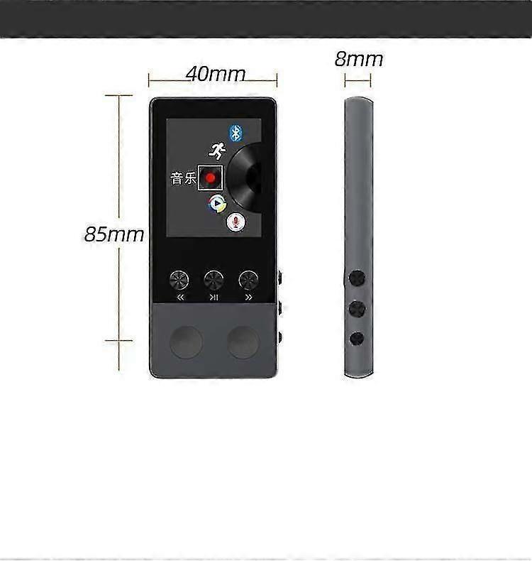 Portable Bluetooth Mp3 Player (Black) This product is shipped according to the color or size of the main picture on the product page. Color: Black Package List: 1x MP3 Player 1x Earphone 1x Charging Cable 1x User Manual Specifications: Name: Sport Bluetooth MP3 Player Model: A5 Material: Metal Built-in Memory: 8GB Screen: 1.8 inch TFT Screen Bluetooth Version: 4.2 Battery Power: 400mAh Charging time: About 2 hours Playing time: About 10 hours Recording format: MP3/WAV (32K bps / 64K bps) Playing format: MP3/WMA/WAV/APE/FLAC/OGG/ACC Video format: AMV/AVI Reading format : TXT Support TF card: Max 128GB TF card not included Language: 27 Dimensions: 89*40*9 mm/3.5*1.6*0.4 inches Features: 1. Stylish metal case body, 1.8-inch readable screen and large navigation buttons2. Support lossless formats such as APE/FLAC, and support background playback3. Support Bluetooth connection to car audio4. Hifi lossless sound quality, 5D sound effect5. TXT format e-book, memory reading 6. Built-in PCM microphone, support long-distance recording 7. FM radio with preset function (with recordable function)8. Bluetooth V4.2, better wireless sound quality Note: -Due to shooting and different computer monitors, the color of the item may be slightly different. - Due to manual measurement, the size may have a slight error.