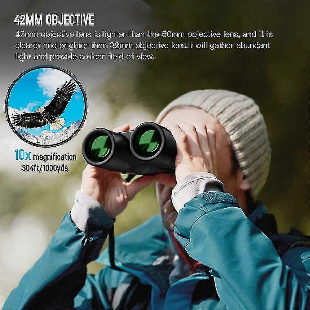 This compact 10x42 binocular lets you see things clearly 10 times closer. The multi-coated lens and high-reflective BAK-9 glass reduce light loss and delivers superior image clarity.The binoculars with auto-focus function will automatically focus the subject for easy and precise focusing.Perfect choice for both adults and children who love outdoor sport activities,such as bird watching, traveling, sightseeing, golfing, climbing, horse racing, concerts and more. Features: No need to twist-up focus ring,the binoculars will automatically focus the subject for easy and precise focusing. 10x magnification to follow your subject more easily. 42mm large objective lens for wider field of view. Multi-coated lenses help obtain high resolution and high contrast views for brighter and clear images. High-reflective BAK-9 glass gives you enhanced color fidelity and accurate color reproduction. Adjustable eyecup are perfect for use with or without glasses. Foldable design and adjustable eye-distance,compact and portable to use.Suitable for kids and adults. Tripod interface to securely connect to your tripod(not included). PVC frame and rubber covering for light weight and waterproof use. Nonslip texture provide comfortable and firm grip. Lens caps and cleaning cloth provide better protection for lens. Come with a storage bag and a neck strap ,convenient to take this binocular anywhere. Great for bird watching, hiking, camping, traveling, wildlife, scenery, etc. Specification: Magnification: 10X Objective Lens Diameter: 42mm Eyepiece Lens Diameter: 15mm Eye Relief: 13.6mm Exit Pupil: 4mm Angle of View 5.8 Field of View101-1000m (304ft/1000yds) Adaptable to tripod: Yes Size144 * 127 * 54 mm / 5.7 * 5.0 * 2.1 in Weight: approx. 750 g / 1.7 lb Package size: 180 * 150 * 80 mm / 7.1 * 5.9 * 3.1 in Package weight: approx. 800 g / 1.8 lb Package List: 1* Binoculars 1* Storage Bag 1* Neck Strap 1* User Maunal 1* Cleaning Cloth 1* Eyepiece Lens Caps 1* Objective Lens Caps