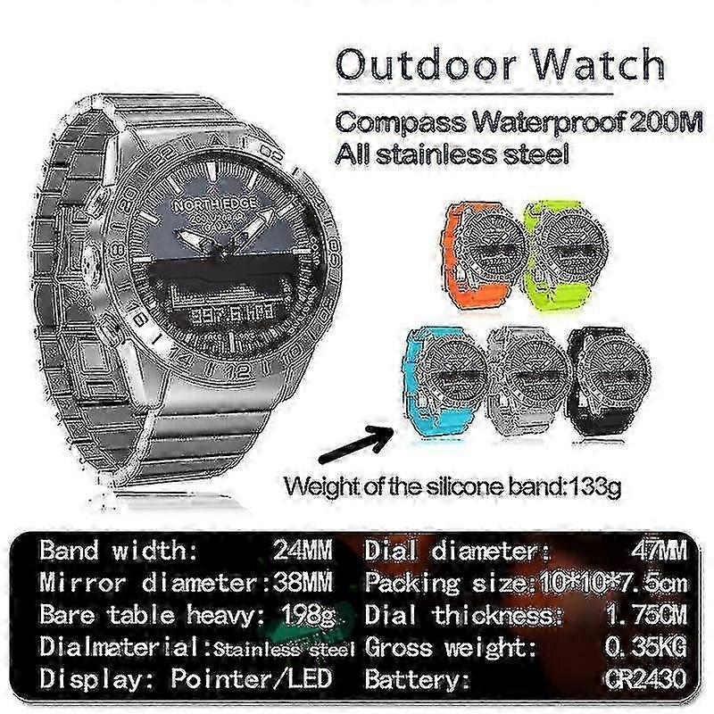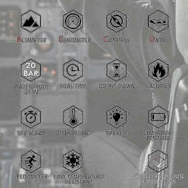 Function0, Dive Mode (Dive depth, Max dive depth 50m, water temperature)1, Waterproof 200m2, Altimeter3, Barometer (48 hours air pressure trend chart)4, Compass5, Thermometer (Temperature)6, Pedometer, step counter, calorie, distance record7, Time functions: hour, minute, second, year(2000-2099), month, date, weekday, 12H/24H format8, Countdown timer (99:59:59~0)9, Stopwatch (0~99:59:59), 50 sets of data10, Worldtime functions (daylight sav time switch automatically)11, Digital compass12, Battery life remind13, EL BacklightFAQQ1. Why the temperature is incorrect?A1. when the watch worn on the arm, affect by the human body haetm the tempearature value display on the screen will be higher than room temperature. So if you want to get the room temperature, please put the watch on a table, and avoid direct light on it, the actual room temperature will show on the watch after 20 minutes.Q2. How long can the watch battery use?A2. Can be used about 12 months. battery no. is CR 2430 . you can use one coin turn concentrate back coverQ3. Can the button work normally in the dive mode?A3. Can't, Consider div safety, button are closed under div mode. expect "light" buttom.Q4. What is the diameter of the screen protector glass?A4. The New Gavia 2 screen is curve, can suit soft film Screen protector glss dia is 40mm.Q5: Why is my watch time wrongA5. Before us the watch, you need to calibrate the hands. In the manual 5.0, there is a method of how to calibrate the hands, or you can contact us, we have a videoColor: blue, black, orange, green, grayModel: GAVIAScreen size: 1.8 inches: NoneCommunication function: not supportedScreen resolution: number+pointerMenu language: EnglishCommunication type: non pluggable cardScreen material: mineral toughened glassPack list: manual, watch, shockproof pillow, warranty cardBattery capacity: button batteryOperation mode: button typeWrist strap material: siliconeCompatible platform: Alibaba Cloud OSFunction: waterproofWear mode: wrist strap