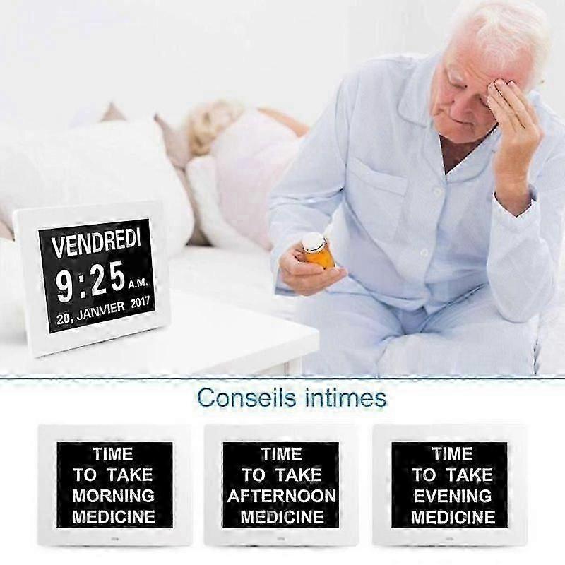 Clock CalendarAuto Dimming3 Medication Reminders 5 Alarms, Digital Day Clock, Date AM PM, Calendar for Seniors, Elderly, Visually Impaired, Alzheimer's ClockMaterialABSScreen: 8 inchesColor:WhiteTime Mode: 12 Hours/24 HoursResolution: 1024*768Calendar: Month/Date/Year or Date/Month/YearBrightness: 350cd/m2Screen ratio: 4:3Product Weight: 0.37Kg/0.82lbInput: DC5V/1AViewing area: 16*12cm/6.30*4.72inchProduct size:21.5*17*2.4cm/8.46*6.69*0.94inchCertificates: CE,FCC and RoHS+ productAuto Dimming: The digital calendar clock will automatically dim at 7:00 PM and light up at 7:00 AM. It will not influence sleep when it is a bedside clock. The function can be turned off if you choose high brightness all day.8 LANGUAGES: Equipped with 8 language display function, which is very convenient for people of different nationalities and regions to use. The elderly clock supports English, Polish, Dutch, Swedish, Italian, German, French and Spanish.8 DALARME OPTIONS: 5 daily clocks and 3 medication reminders Morning/afternoon/evening medication reminder for seniors with Alzheimer's dementia, memory loss or visually impaired seniors to ensure they take their medication on timeAlzheimer's Calendar Clock: For seniors with dementia, Alzheimer's and memory loss, this clock is a thoughtful gift for those who are always busy.FeaturesPackage Included: 1x Digital Day Calender Clock 1x Adapter 1x User ManualHD DISPLAY FUNCTION9 inch 1024*600 HD LED clockdigital clock clearly shows time, time of day, full day of the week, month and date, extra large clock in bold unabbreviated lettersThis is a high-definition LCD display electronic clock specially designed for the elderly, children or Alzheimer's patients. Its features are clear large character display, multiple alarms, can be placed or wall-mounted, easy to use, and supports 8 languages (including French), etc.