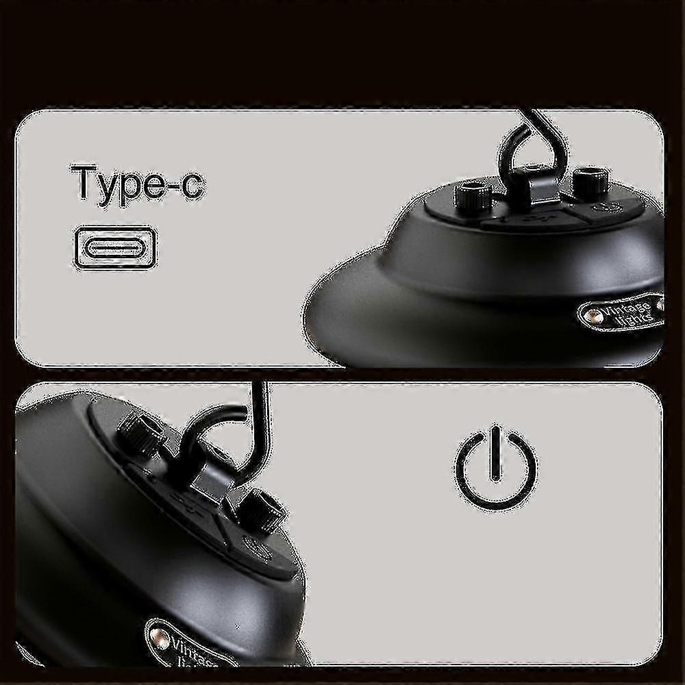USB or battery charging,switch button,easy to useSoft lighting,suitable for camping,party,atmosphere,lighting, etc.Warm candlelight atmosphere, warm orange light with LED filamentWeight: 118gColour: BlackMaterial: Metal + ABSPackage Contents:1 x Camping lanternOnly the above package content, other products are not included.Note: Light shooting and different displays may cause the color of the item in the picture a little different from the real thing. The measurement allowed error is +/- 1-3cm.