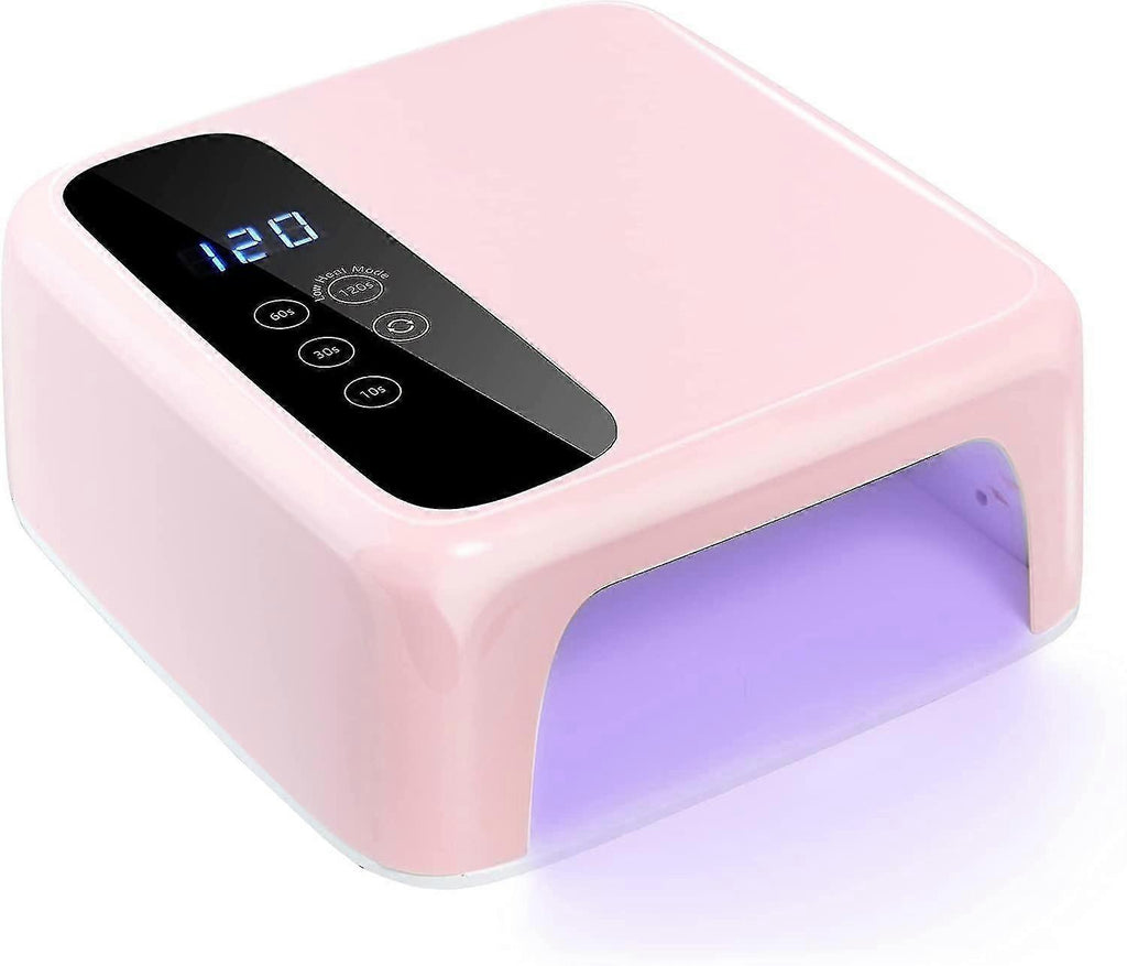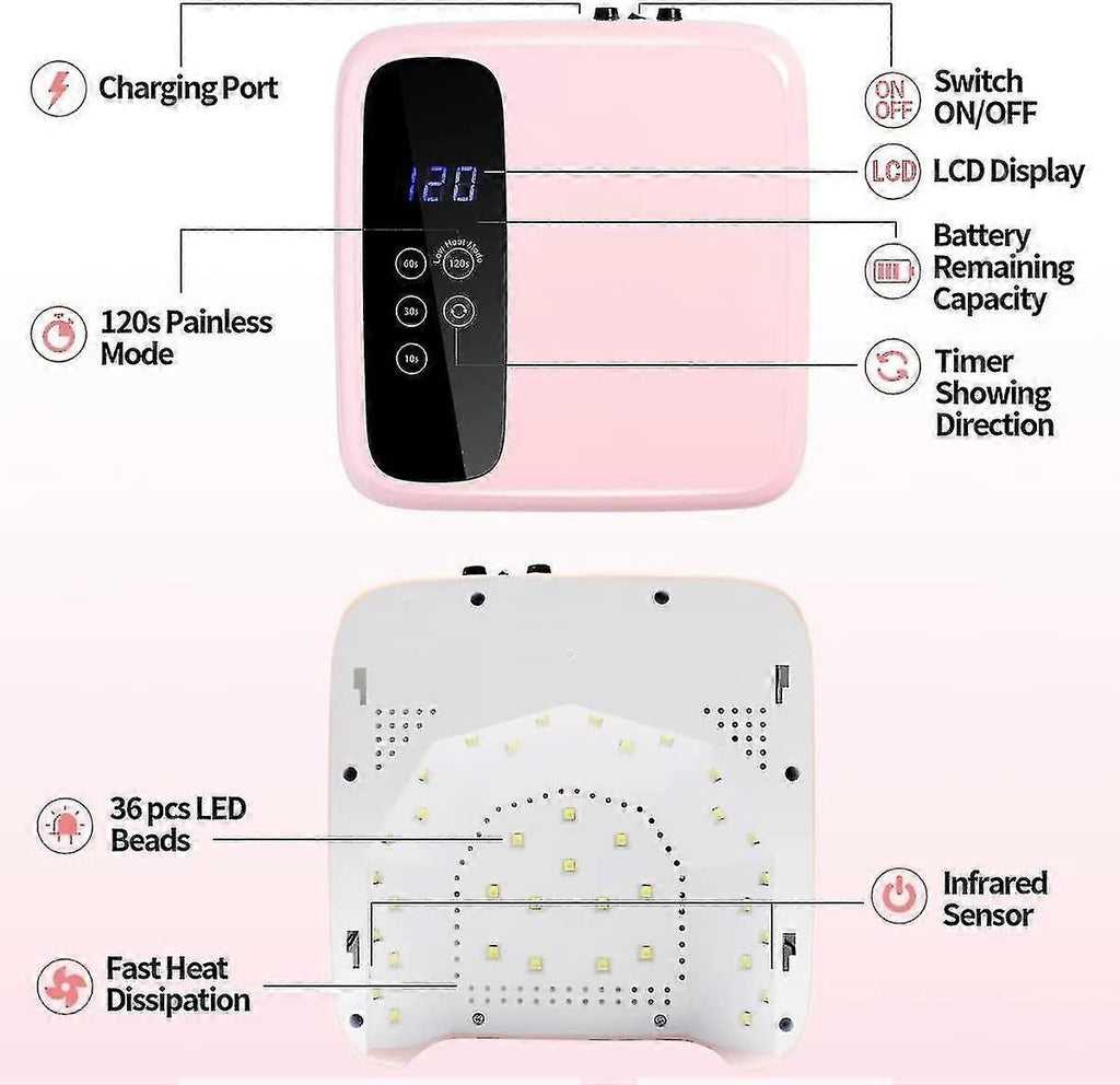 Rechargeable Cordless Design This cordless UV Led manicure lamp has a built-in rechargeable battery, and the high-quality battery can be used for 2-3 hours after being fully charged. It is suitable for use at home and outdoors, and you can take it anywhere you want. LCD display and 4 timing settings Full touch LCD display with 4 timing settings (10s-30s-60s-120s), which can be selected according to your needs. With sensor settings, when you put your hand in it, it automatically senses and works for 30 seconds without pressing any keys. 36 lamp beads and 36 dual-wavelength LED lamp beads, with a maximum power of 72W and dual-wavelength (365nm+405nm) lamp beads, can quickly cure various types of nail polish from all angles. There is also a 120s smart painless mode option for easy manicure. Uniquely designed, this rechargeable nail art lamp uses a romantic and beautiful pink color, and the surface is coated with UV for a more textured look. The orientation of the LCD display can be reversed so that both the manicurist and customer can see the manicure light countdown