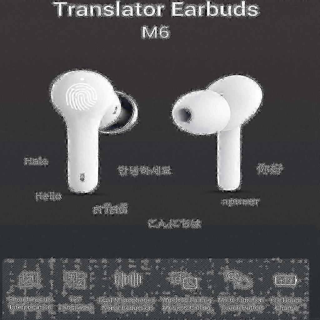 M6 is the premium translation earbuds that not only offer online Translation also can be used for everyday tasks like listening to music or making phone calls.M6 language translating device earbuds delivers natural and seamless communication, smash language barriers.With translator earphones, you can yourself freely in any language you wish any time and any place.Category: AI instant translation earplugsSeries/Model: M6Bluetooth (earbud type): 5.0Maximum. Connection distance: 10 Automatic connection: automatically connect within 0.5 of the mobile phoneAutomatic reconnection: automatically by pulling the earbuds out of the charging caseBattery duration (per earplug): 5 hours+Charging time: 1.5 hoursCharging time (charging box): 1.5 hoursCharging port: TYPE-CWearing style: shallow in-ear styleNoise reduction: beamformingMobile phone system version: Android 7.0/for iOS 11.0 and aboveColour:WhiteMaterial:ABSPackage Contents:2 x Headphone1 x Charging compartment1 x Charging cableOnly the above package content, other are not included.Note: Light reflection and different displays may cause the color of the item in the a little different from the real thing. The measurement allowed error is +/- 1-3cm.