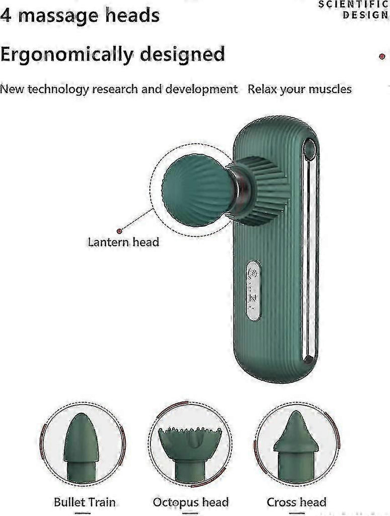 Function: Four massage heads made of rubbery material, closer to the skin, 3 gears, rotation speed 1000rpm-3200rpm/min, which can be switched as needed to achieve the best massage effect and powerful output. Strong Power: equipped with a powerful motor, 55 times per second and a torque of up to 5 kg/cm, which helps to effectively relieve pain throughout the body, relieve stress, promote blood circulation, relax muscles and help speed up recovery. Long-Lasting use: 800 mAh lithium-ion battery, can be used for 30 minutes a day and can last for 10 days.The fuselage is made of aluminium alloy, light and easy to dissipate.Less than 43dB noise Easy to carry: Weighing only 280 g and measuring 14. x9x4. 5 cm, it is easy to carry around in bags and sports bags. Suitable for muscle stretching, exercise, daily massage, repairing and conditioning Powerful, low noise, very quiet Small but powerful, four different massage guns are enough to meet the needs of users. There are four different gears, each with a different strength, according to your needs Low noise design, don 39;t worry about causing trouble to others. Comes with four massage guns, USB charging cable. Equipped with four different shapes of massage guns, each massage effect is not required, you can choose to use. Charging is simple, use USB charging, and provide power bank. ColourGreen Quantity1set Voltage: DC12V Charging port Type-C interface Lithium battery 1500/2000 MAH high performance lithium battery (3C power battery) About 10 hours of battery life Working time is about 3 hours Maximum power: 54W No-load power: 7W Rated power 25W Rated current 2a