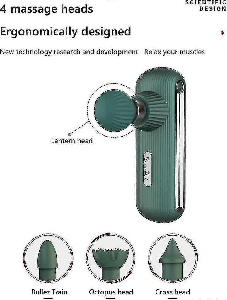 Function: Four massage heads made of rubbery material, closer to the skin, 3 gears, rotation speed 1000rpm-3200rpm/min, which can be switched as needed to achieve the best massage effect and powerful output. Strong Power: equipped with a powerful motor, 55 times per second and a torque of up to 5 kg/cm, which helps to effectively relieve pain throughout the body, relieve stress, promote blood circulation, relax muscles and help speed up recovery. Long-Lasting use: 800 mAh lithium-ion battery, can be used for 30 minutes a day and can last for 10 days. The fuselage is made of aluminium alloy, light and easy to dissipate. Less than 43dB noise Easy to carry: Weighing only 280 g and measuring 14.x9x4.5 cm, it is easy to carry around in bags and sports bags. Suitable for muscle stretching, exercise, daily massage, repairing and conditioning Powerful, low noise, very quiet Small but powerful, four different massage guns are enough to meet the needs of users. There are four different gears, each with a different strength, according to your needs Low noise design, don't worry about causing trouble to others. Comes with four massage guns, USB charging cable. Equipped with four different shapes of massage guns, each massage effect is not required, you can choose to use. Charging is simple, use USB charging, and provide power bank. ColourGreen Quantity1set Voltage: DC12V Charging port Type-C interface Lithium battery 1500/2000 MAH high performance lithium battery (3C power battery) About 10 hours of battery life Working time is about 3 hours Maximum power: 54W No-load power: 7W Rated power 25W Rated current 2a