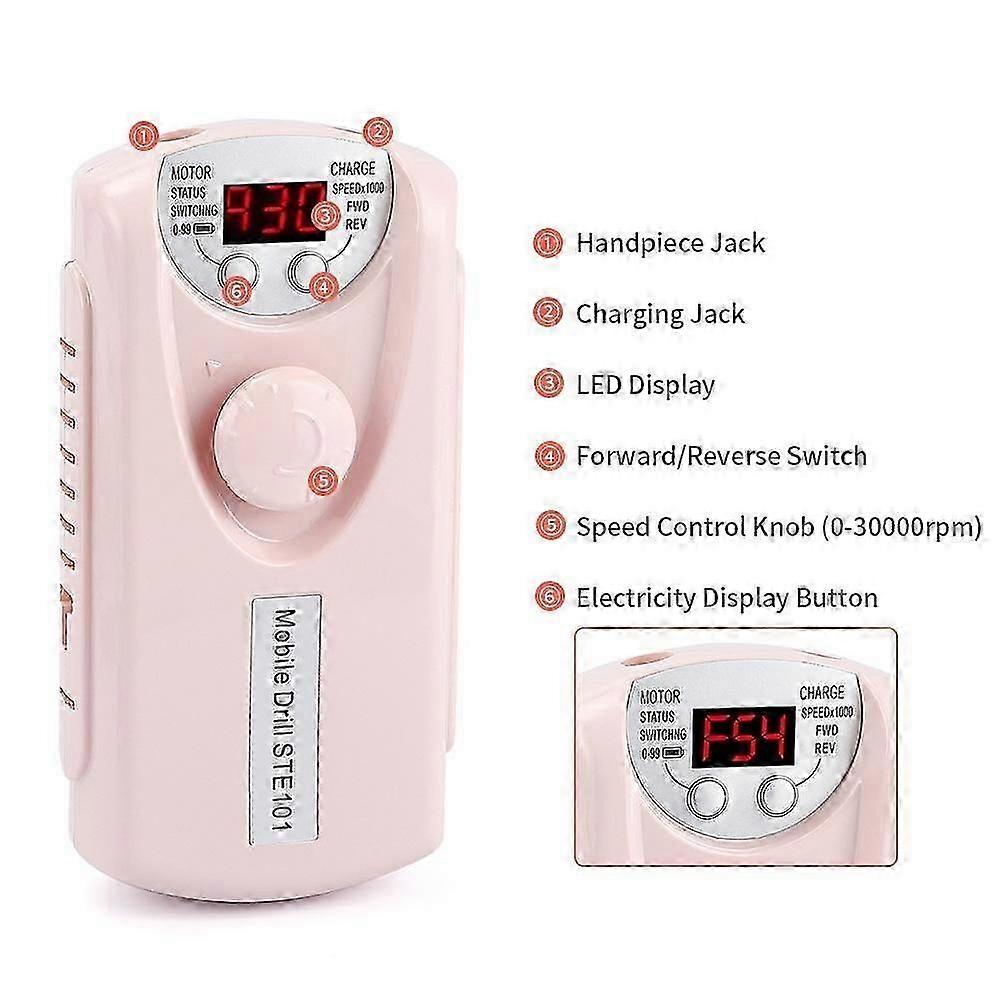 1. This portable nail drill machine adopts a small and exquisite design with a belt clip, which is convenient for users to carry and use. 2. The device is equipped with a 2600mAH large-capacity battery, which can work continuously and is easy to operate, so you don't have to worry about the problem of insufficient battery power. 3. The equipment has LED display speed, battery capacity, forward and reverse and other system conditions, and the membrane switch has a dustproof function, which is safer and more reliable to use. 4. The equipment is convenient and quick to replace the drill bit without additional tools, which can greatly improve work efficiency and make the manicure process smoother. 5. The equipment adopts multiple protection measures, including charge and discharge delay monitoring protection, battery overheat protection, overload system protection, which effectively protect the safety of equipment and users. Products include: a host, a handle, six basic nail drill bits, a mobile phone holder, an adapter, an instruction manual and a box.