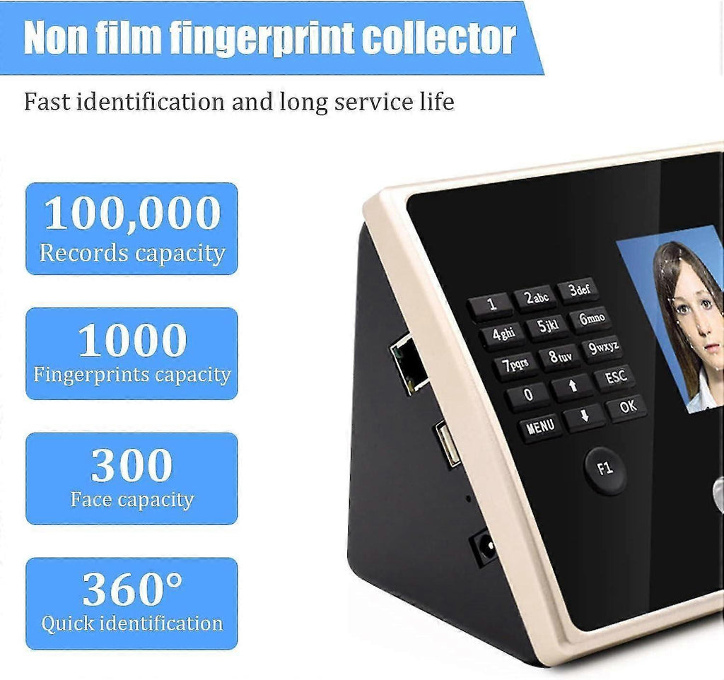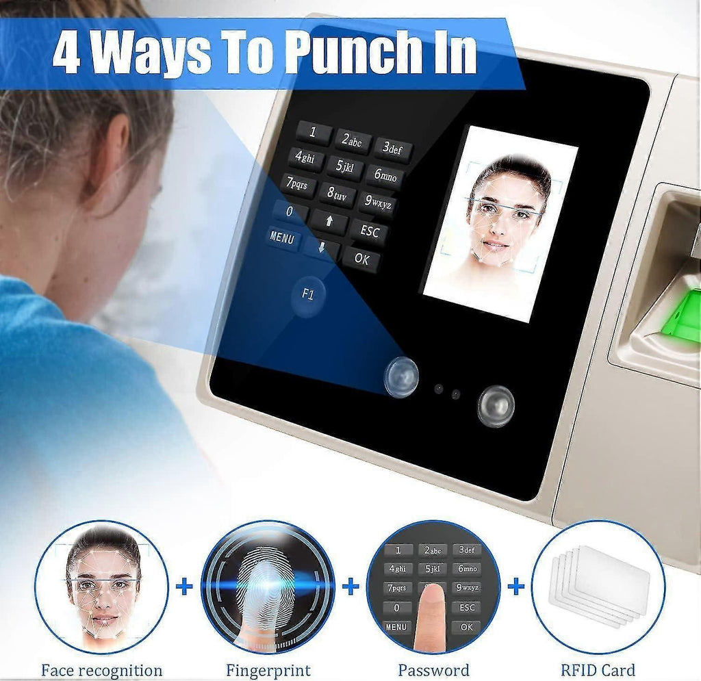 [4-in1 Intelligent Punch Card Terminal]-Our time clocks for employees small business is adopted high-performance core processor,the strong compatibility and function expansibility,come with 5pcs ID card support RFID,fingerprint,password,facial recognition four-in-one to unlock.Different from traditional paper card attendance,really convenient.You can according to employee preferences,or a special use scenario to choose punching clock in and out methods. [Face Recognition Time Clock]-This face recognition attendance machine can help you punch in efficiently.Just need to stand in front of the employee time clock machine,you can punch in quickly and successfully.Infrared dual cameras,multi environment recognition,using infrared multi light source irradiation,HD dual cameras,three-dimensional imaging.Wear glasses,day and night,even makeup can be identified easily. [Large-Capacity 360C Fingerprint Identification]-Our fingerprint time clocks for employees has 100000 recording memory,which can input 1000 fingerprints and 300 faces,and quickly identify 360 degrees.Non film fingerprint collector,360degrees fingerprint identification technology,fast identification,long service life,can quickly identify fingers from different angles,dry,wet or even peeling fingers can also punch in successfully. [U Disk Attendance Report Download]-Our clock in and out machine for employees will come with a 16GB U Disk.No need to connect to the network,automatic report,you can use the U disk upload and download data,very easy to complete attendance.You can also set a password for the data report of the work time clock machine to make the attendance data more secure. [Voice Prompt High Performance]-Our biometric technology employee time clock takes high-speed processor with powerful performance and 0 delay response.The accurate fingerprint,face recognition and ID card,in less than 0.8 seconds and voice prompt to make your employee punch into work faster.Built-in precision time crystal oscillator with power-off protection function,no worry about your attendance date lose.