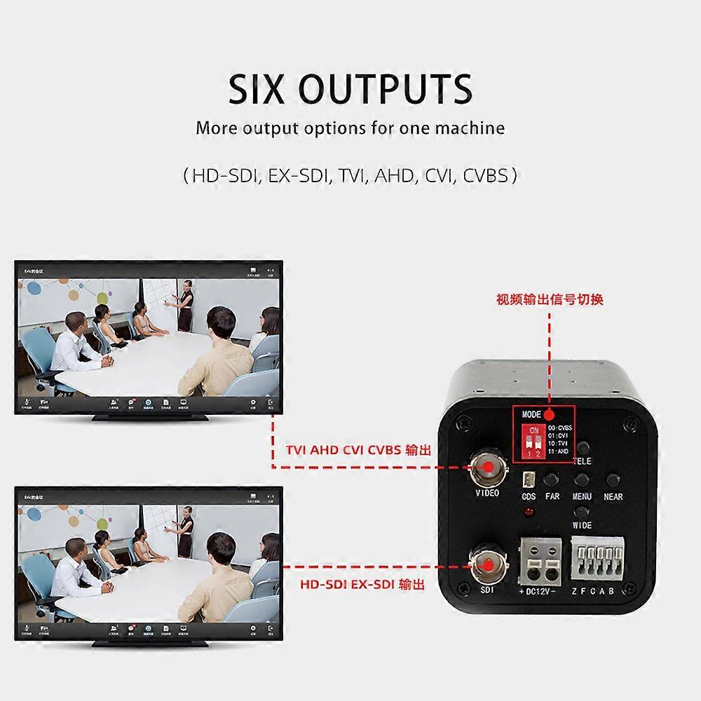 Versatile Video Output: The camera supports multiple output formats, including HD-SDI 1080P, AHD, CVI, TVI, and CVBS (1200TVL), making it compatible with a wide range of security systems.