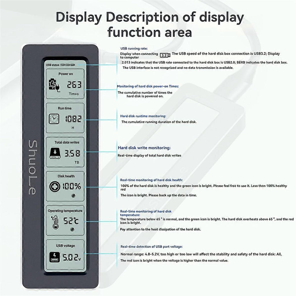[HD Screen Design] Come with HD display to monitor your hard drive usage in real time. Display content includes: Total data writes,Run time,Power on,Disk health, Operating temperature,USB voltage.The datas on the display allow you to monitor the usage of the hard disk more directly,When your hard drive health is below 100%, you need to attention to backup data in time. [10Gbps Supper Speed] USB3.2 Type C NVME/NGFF enclosure mission speed is up to 10Gbps, After installing the SSD, the read and write speed can reach 1000-1200MB/s.And HD movie mission only takes 2 seconds. The perfect data fer and backup solution. Backward compatible with USB 3.1 Gen1 and USB 3.0 with speeds up to 6 Gbps. [SUPPORT MULTIPLE OPERATING SYSTEMS] is engineered with USB 3.2 Type c interface, support hot-shippable, Plug and Play, No Driver required. Supports /forMac/Linux. This external hard disk box is suitable for connecting computers, Smartphones, laptops and other devices. Please note, all new solid-state drives must be formatted before use. [Strong Heat Dissipation] M.2 adapter adopts aluminum alloy shell, slim design, and excellent heat dissipation. [Wide Compatibility] This only compatible with both SATA and NVMe in sizes 2230 2242 2260 2280, such as M.2 NVMe/SATA PCIe M key, PCIe key SSD; For the System, NVME SATA Enclosure support Multi OS, , OS, Linux, Android. Product Name:M.2 Screen Display Hard Disk Case Supported Capacity:Supports up to 4TB hard drives mission speed:10Gbps External interface:USB3.2 Gn2 Type-C Colour:Deep Space Gray Material:Aluminum Alloy Package Contents: 1 * SSD Enclosure 1 * USB A to USB C data cable 1 * USB C to USB C data cable Only the above package content, other products are not included. Note: Light reflection and different displays may cause the color of the item in the picture a little different from the real thing. The measurement allowed error is +/- 1-3cm.