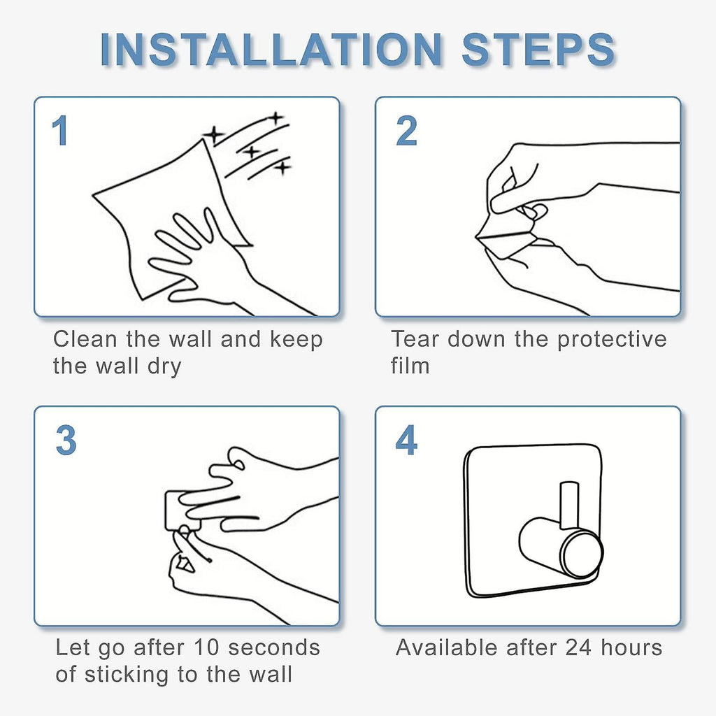 High-quality material: The towel hook is made of high-quality space aluminum, which is rust-proof, waterproof, corrosion-resistant and has excellent load-bearing capacity. 3M tape has the best adhesion. (Dimensions: 4.5 x 4.5 x 3 cm. Easy to install: Peel off the protective film on the back and stick it on a smooth surface. It only takes seconds and saves time and Energy. Finally, wait 24 hours before hanging anything. Wide application: Suitable for wood, glass, tiles, walls, bathroom doors, latex, kitchens and other smooth walls. (not suitable for matte wallpaper walls or Lime walls) STRONG HOLD: To successfully install these strong adhesion towel hooks without drilling the room aluminum, it is very important that the user clean the surface of grease, dust and dirt before attaching the hook.