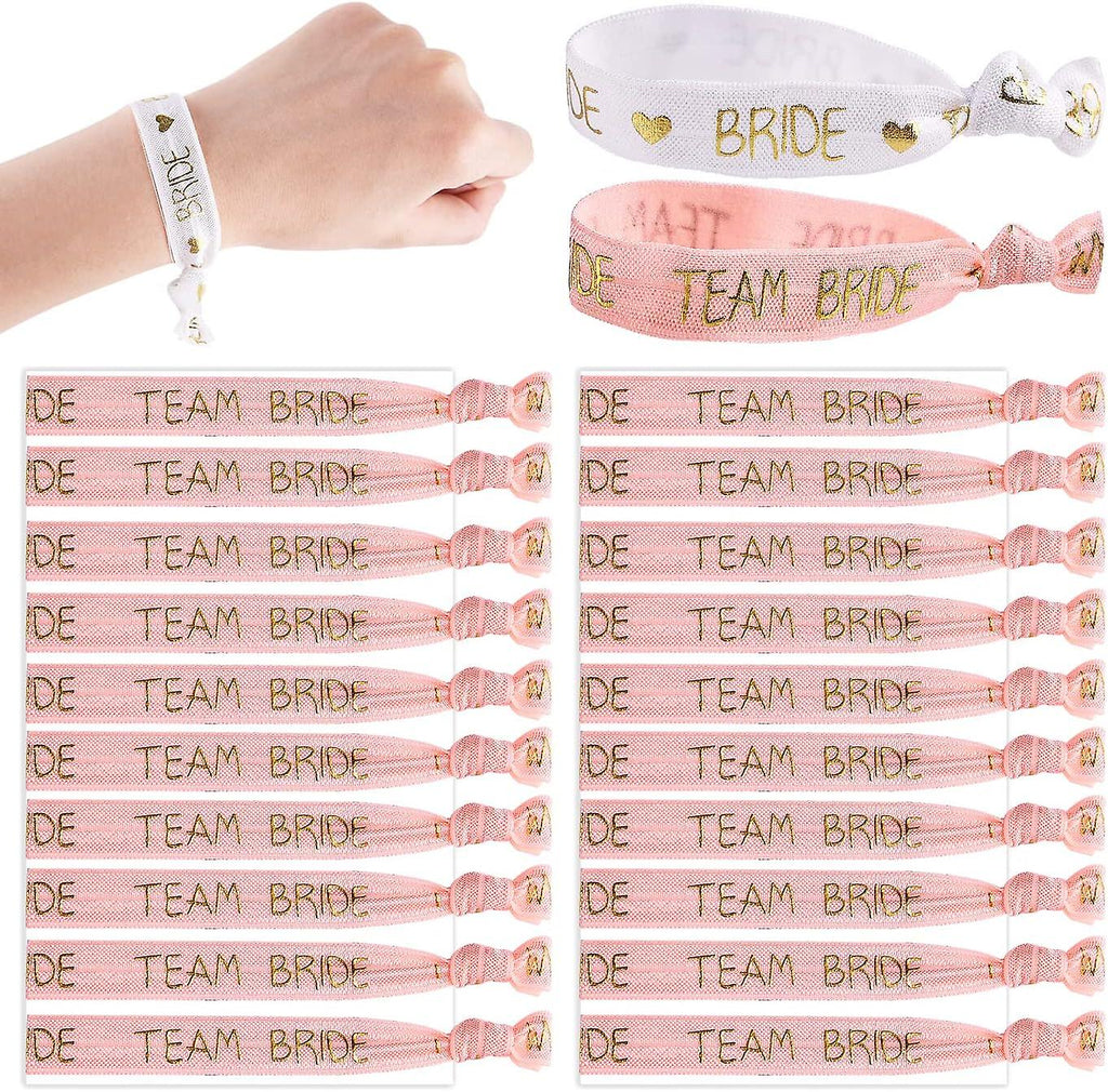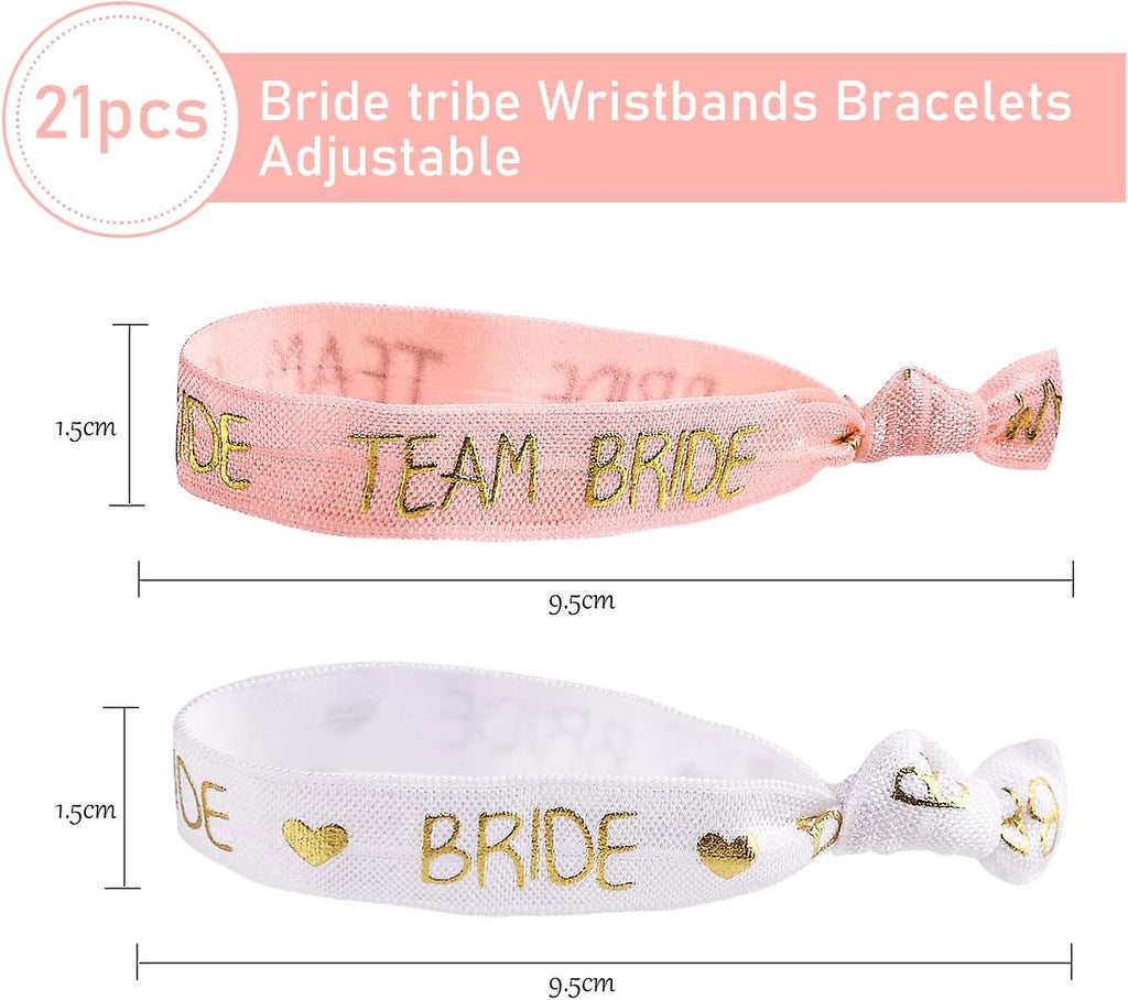 Package Included: You will receive 21 pieces of team bridal bracelets (1 x bride + 20 x team bride), white+pink, gold lettering, stand out at the party High-quality material: Made of high-quality Polyester fabric, soft and comfortable to wear, adopts font hot stamping technology, durable and not easy to fall off Size: each bracelet measures approx. 9.5 x 1.5 cm, adjustable elastic band, easy to put on. and take off, suitable for most people Bridal Tribe: One for the bride and another for your girlfriends PERFECT ACCESSORY: Bracelets are stretchy and can also be used as headband accessories, suitable for gifting to brides, bridesmaids, relatives and friends at wedding receptions, bridal showers, bachelorette parties, decorations and more.