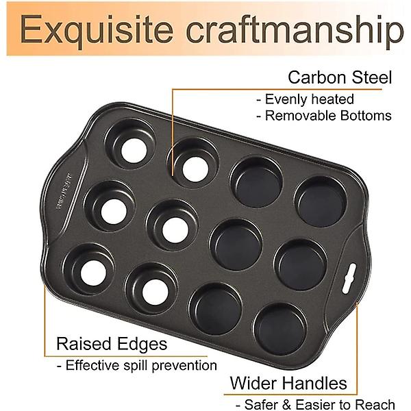 describe: [Non-stick coating]: No matter what you're cooking, the durable non-stick and scratch-resistant coating on our mini muffin and cupcake tins ensures your food won't slide or pop out easily makes cleaning a breeze [Size]: This mini set fits most ovens. [Performance] : The sturdy construction of this mini muffin pan distributes heat throughout the pan, ensuring your mini muffins bake evenly. [Sufficient capacity]: The mini muffins Muffin tin can bake 24 small cakes at the same time, meeting the family's daily needs. [Care instructions]: This mini muffin and muffin tin is dishwasher safe; however, for best results, wash with warm, soapy water before first and each use