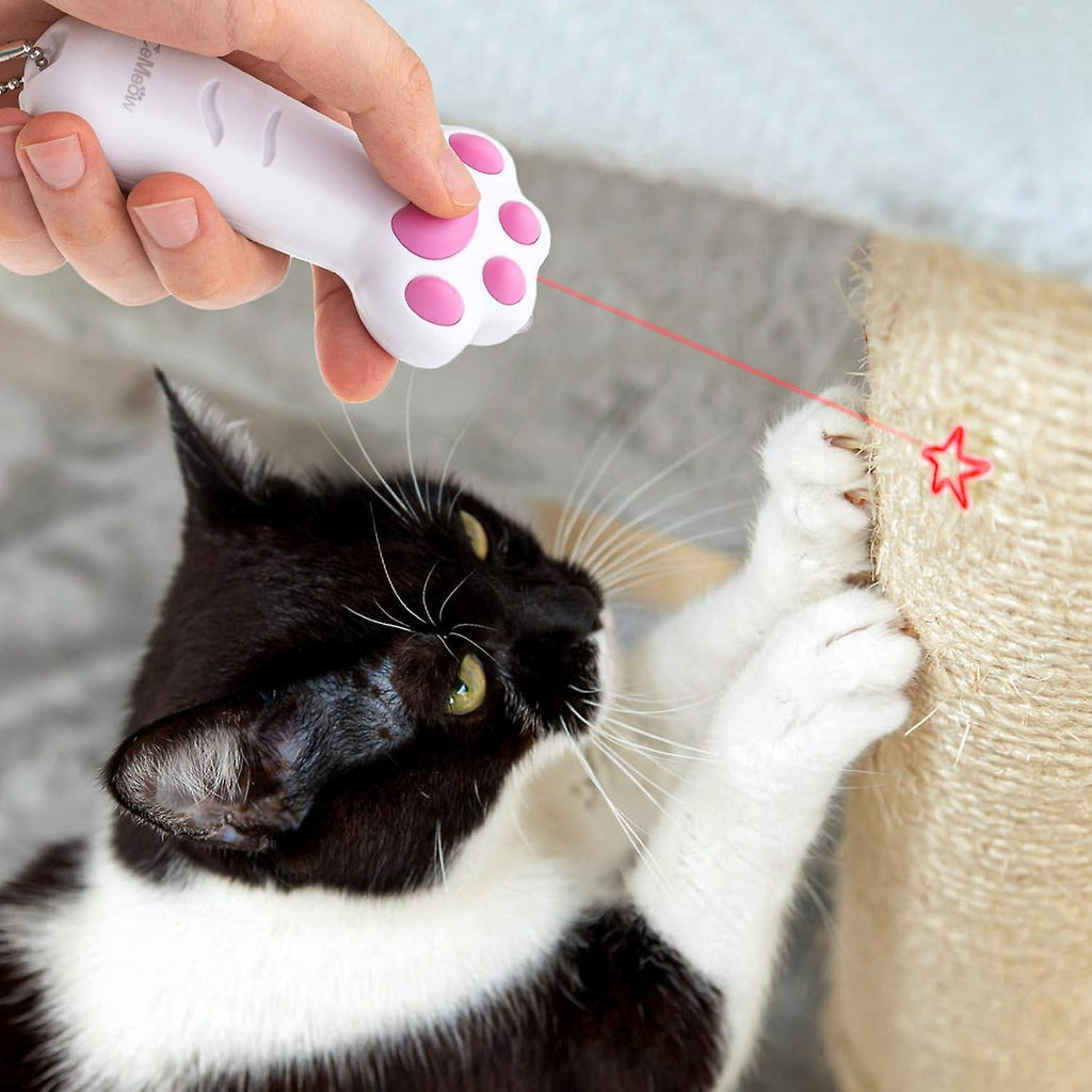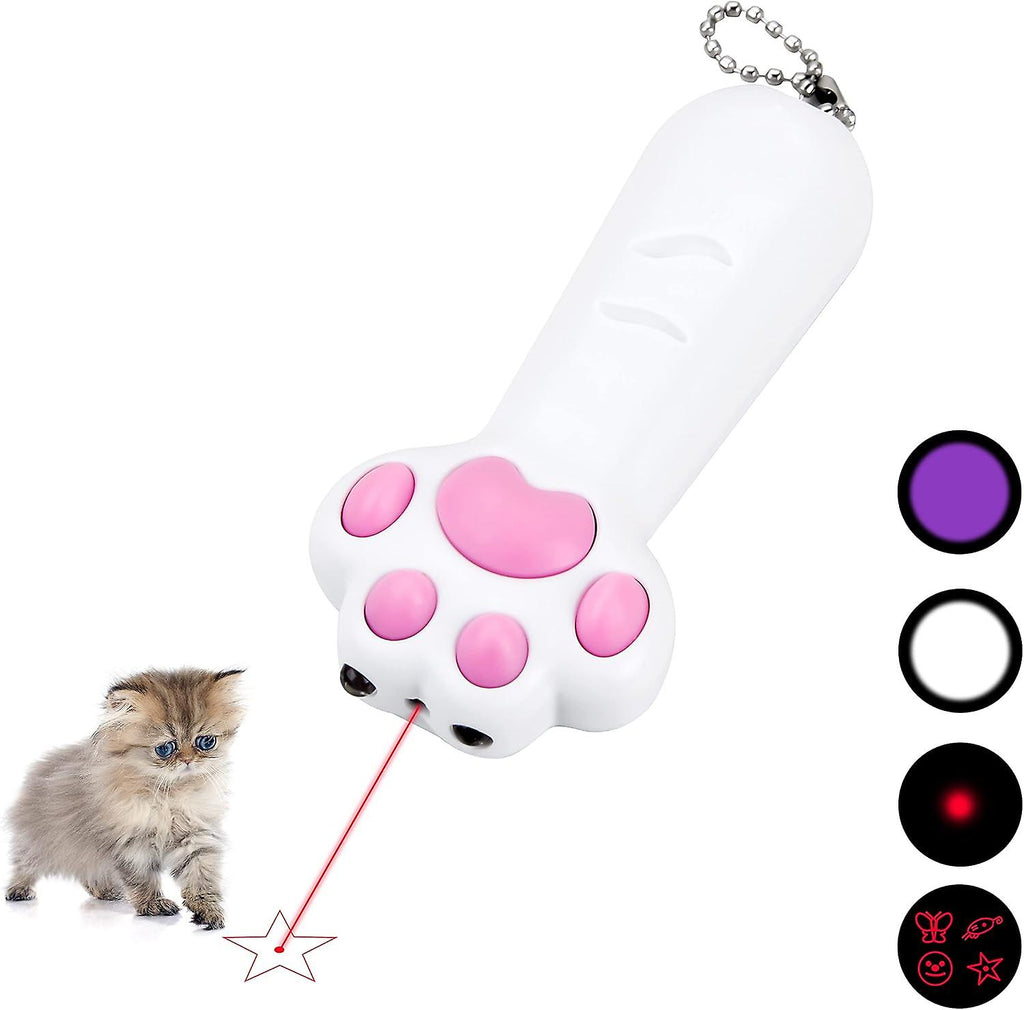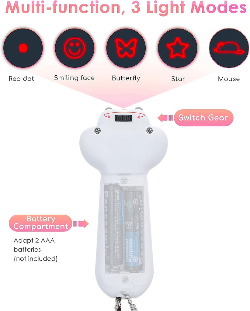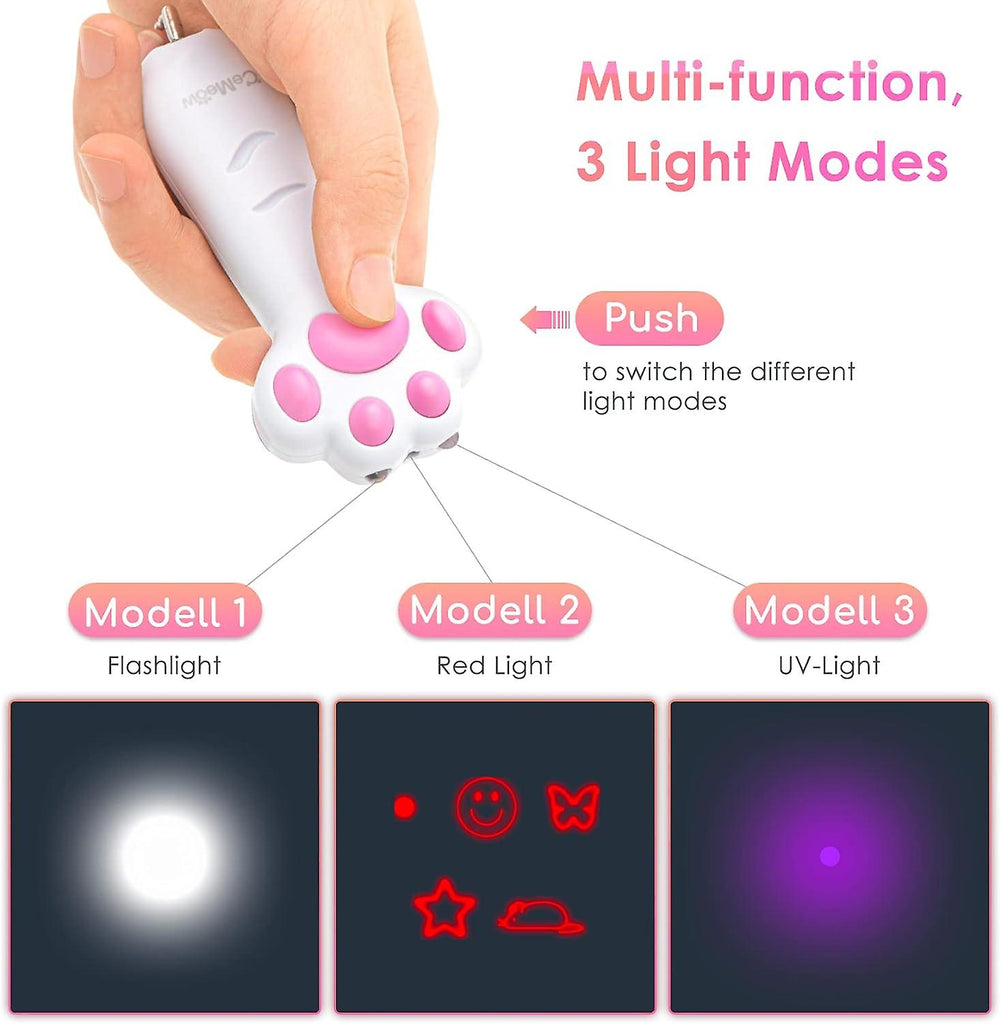 7-IN-1 FUNCTION: LED infrared offers 5 different styles to choose from, allowing cats to hunt and play. It can also be used as a household emergency lighting device, and the ultraviolet light can detect the authenticity of currencies and check the liquid of pets. Small and cute: The design is inspired by the cute paws of cats. The palm is used as a button to switch between different functions, combining beauty and practicality. Note: The gear on the back is used to switch the infrared mode Good for health: Interactive toys can not only bring endless fun, but also train pets' agility, satisfy cats' curiosity, entertain and teach and reduce cats' anxiety. Do some exercise every day to avoid pet obesity Easy to carry: The toy only weighs 36g, you can take it with you at any time. With the lanyard at the bottom you can easily attach it to a keychain or hang it for storage. NOTE: Requires 2 AAA batteries for battery operation (batteries not included)