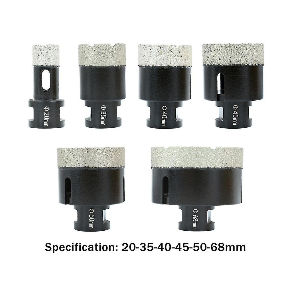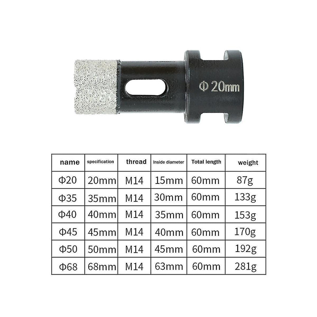 length: 60mm Coating length: 10mm Thread: M14 Diameter: 20mm,35mm,40mm,45mm,50mm,68mm Application: Used for opening holes in marble, ceramic tiles, granite, , walls and other materials color:Photo color Material:Metal Package Contents: 6 x Tool Only the above package content, other are not included. Note: Light reflection and different displays may cause the color of the item in the a little different from the real thing. The measurement allowed error is +/- 1-3cm.