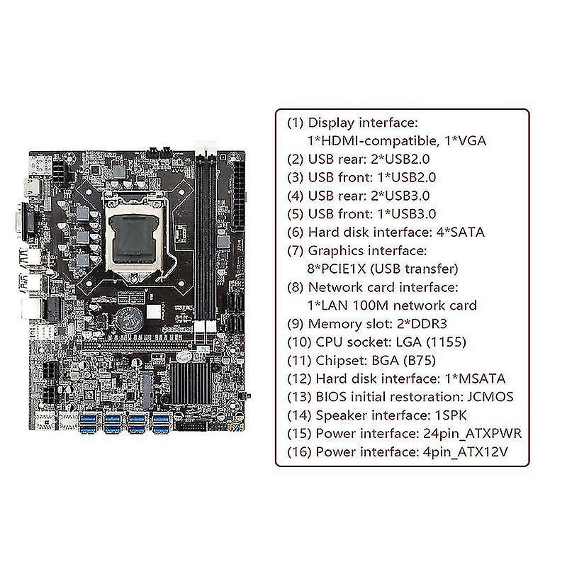 The B75 USB-BTC motherboard uses all-solid capacitors to make the motherboard more stable; it supports LGA1155 CPU and uses the B75 chipset to give full play to the CPU performance; the motherboard is suitable for the mining industry due to low and expansion interfaces. (1) Display interface: 1 x -compatible, 1 x VGA (2) USB rear: 2 x USB2.0 (3) USB front: 1 x USB2.0 (4) USB rear: 2 x USB3.0 (5) USB front: 1 x USB3.0 (6) interface: 4 x SATA (7) Graphics interface: 8 x PCIE1X (USB ) (8) Network card interface: 1 x LAN 100M network card (9) Memory slot: 2 x DDR3 (10) CPU socket: LGA (1155) (11) Chipset: BGA (B75) (12) interface: 1 x MSATA (13) BIOS initial restoration: JCMOS (14) Speaker interface: 1SPK (15) Power interface: 24pin_ATXPWR (16) Power interface: 4pin_ATX12V Colour: Black Material: PCB Network card chip: 1 x REALTEK 100M network card The appearance and color of different batches of products may be different, which will not affect the use Package Contents: 1 x Motherboard 1 x G860 CPU(Note: The CPU is a giveaway, not covered under , not included in the entire order , 't place an order if you mind, .) 1 x DDR3 4GB 1600Mhz RAM (the appearance and color are random, 't accept the specified appearance and color) 1 x 128G MSATA SSD (the appearance and color are random, 't accept the specified appearance and color) 1 x Cooling Fan (the appearance and color are random, 't accept the specified appearance and color) 1 x SATA Cable(random color,Do not accept designation and appearance,Do not accept designation) 1 x Switch Cable(random color,Do not accept designation) 1 x Baffle(random color,Do not accept designation and appearance,Do not accept designation) Only the above package content, other products are not included. Note: Light reflection and different displays may cause the color of the item in the a little different from the real thing. The measurement allowed error is +/- 1-3cm.